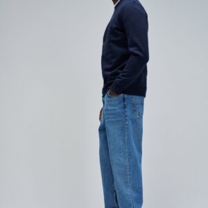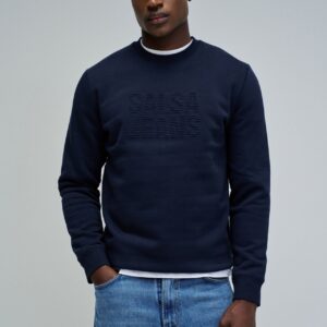 Clássica e versátil, esta sweatshirt em tom azul é uma peça essencial para um estilo descontraído com um toque de modernidade. Com decote redondo e mangas compridas, apresenta punhos, cintura e decote canelados que garantem conforto e ajuste. O branding em relevo no peito adiciona detalhe subtil e distintivo, tornando-a