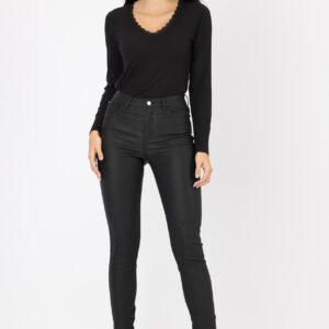Jeans justos de cintura alta com cinco bolsos. Fecho frontal com fecho zip e botão metálico. Efeito encerado. Altura Modelo: 178 cm | Tamanho: 28 Composição: 77% Viscose 20% Poliéster 3% Elastano Cuidados de lavagem: Lavar à temperatura máxima de 30º. Passar à temperatura média (150º C). Não pode usar