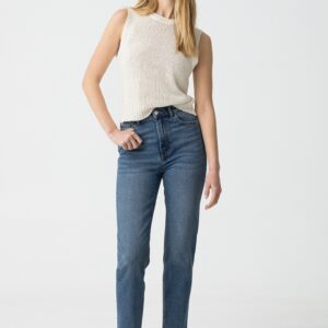 Jeans de cintura alta com cinco bolsos. Fecho frontal com fecho zip e botão metálico. Composição: 99% Algodão 1% Elastano Cuidados de lavagem: Lavar à temperatura máxima de 30º. Não pode usar lixívia. Não pode colocar na máquina de secar. Passar à temperatura mínima (110º C). Não pode lavar a