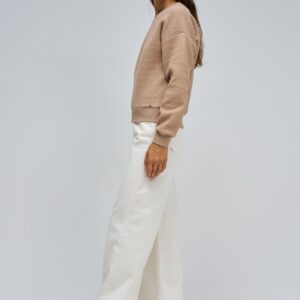 Camisola de malha em tom cru, marcada pela simplicidade elegante do decote redondo e pelo toque delicado das pérolas aplicadas nas mangas. Com fit regular e acabamento canelado nos punhos e cintura, combina conforto e sofisticação em igual medida, perfeita para elevar os looks do dia a dia com um