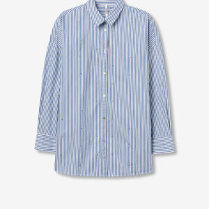 Camisa com colarinho de abas e manga comprida. Fecho frontal de botões. Pormenor de botão metálico em contraste no colarinho. Composição 100% Algodão Cuidados com a lavagem