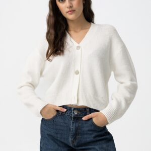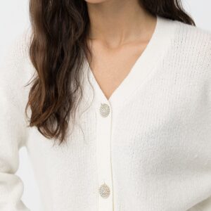Cardigan em malha canelada com design clássico e versátil. Apresenta decote em V profundo, fecho frontal com botões e corte ajustado que valoriza a silhueta. As mangas compridas e o acabamento em punho conferem estrutura, enquanto o detalhe da chapa metálica com o logo na barra acrescenta sofisticação discreta. COMPOSIÇÃO