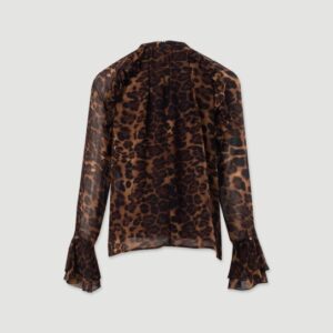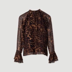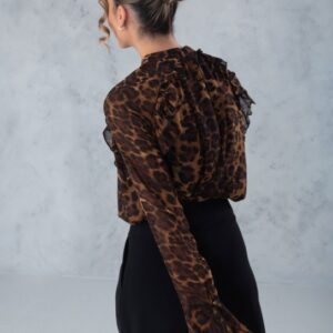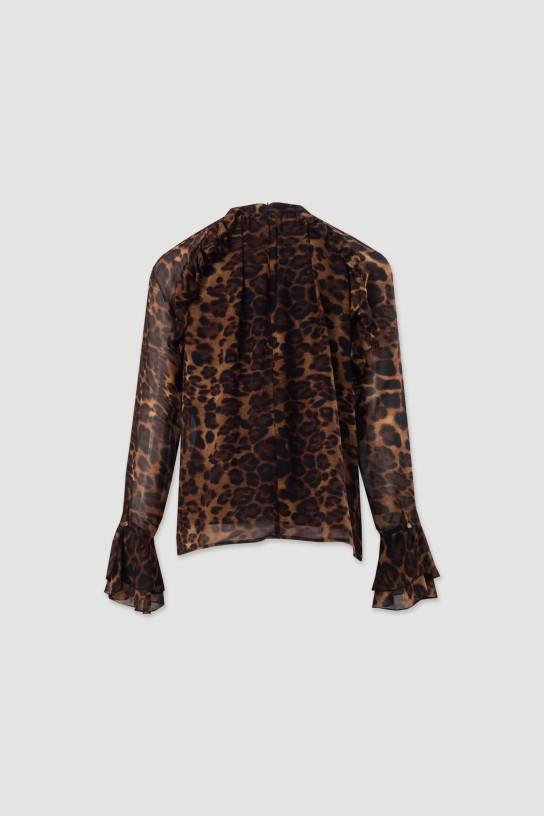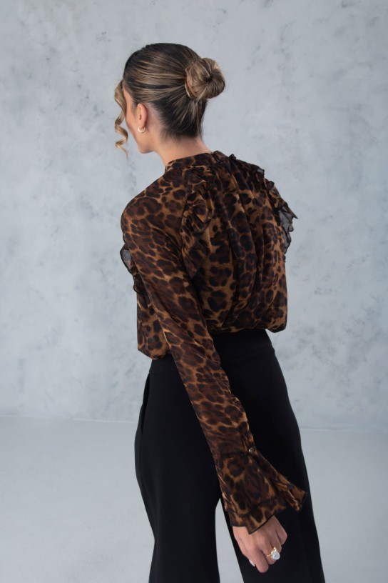 Blusa em tecido estampado animal. Apresenta gola subida com detalhe de pregas e aplicação de folho. A manga comprida termina em folho duplo, conferindo movimento e delicadeza. O fecho de correr nas costas garante um ajuste discreto, enquanto o forro interior no corpo proporciona conforto. Uma peça distinta e elegante, perfeita para coordenados sofisticados.