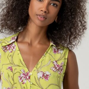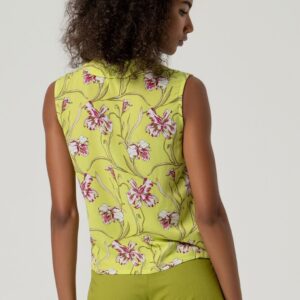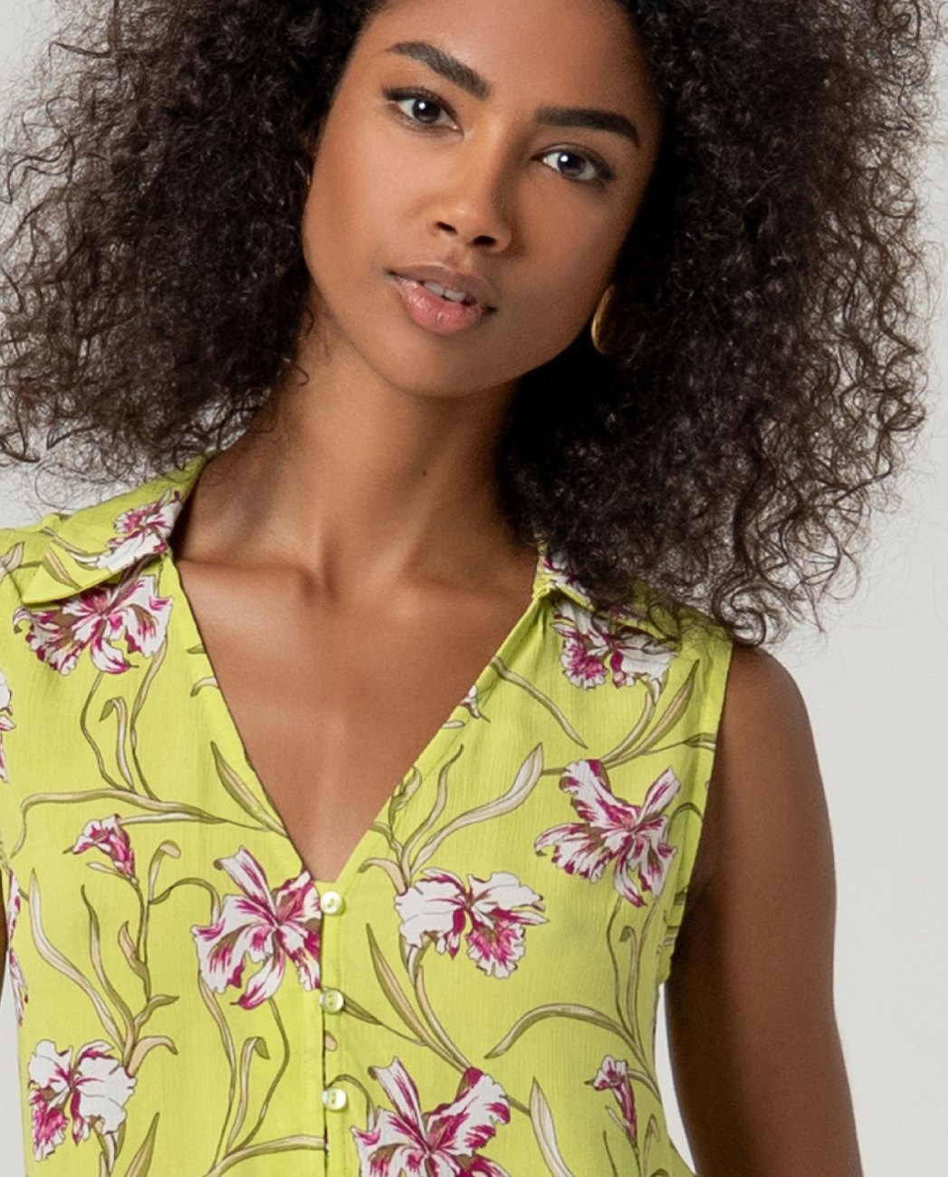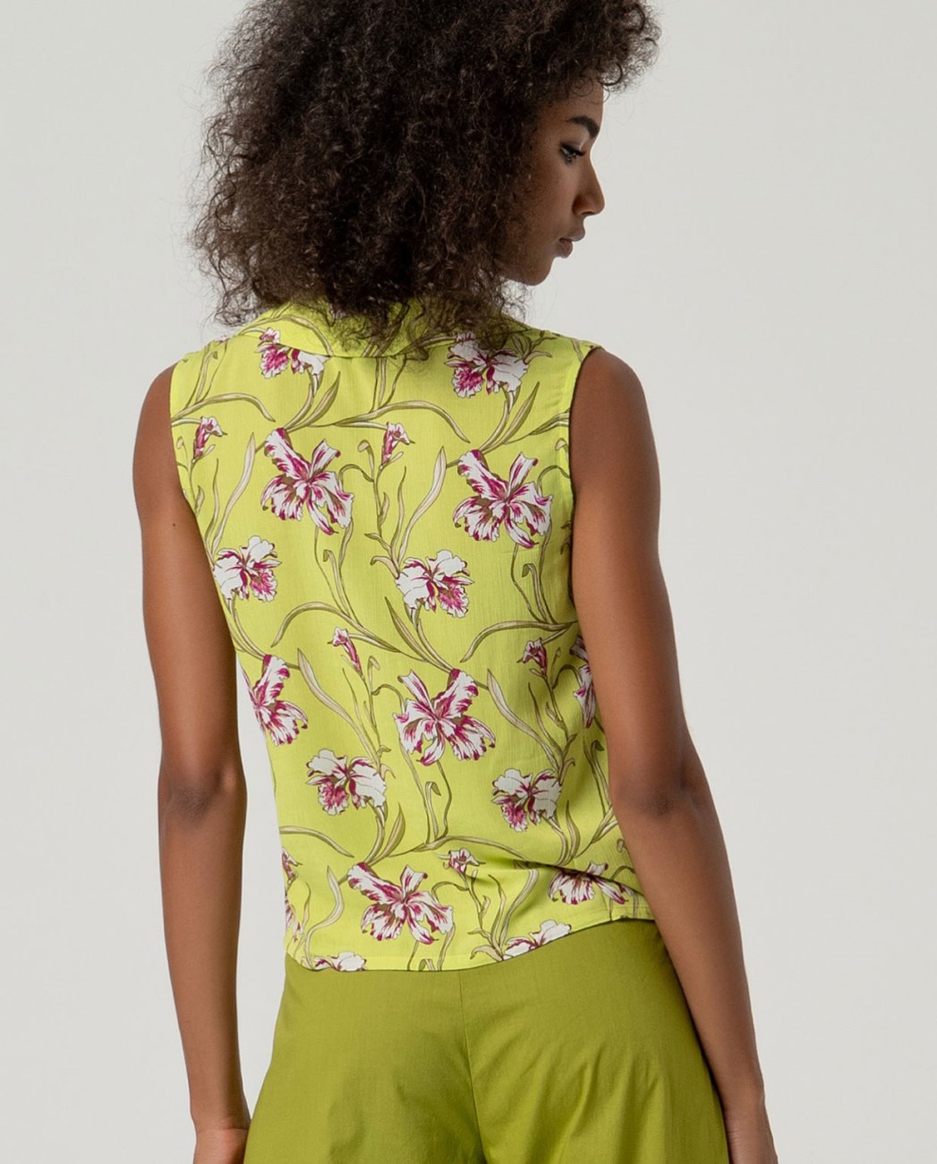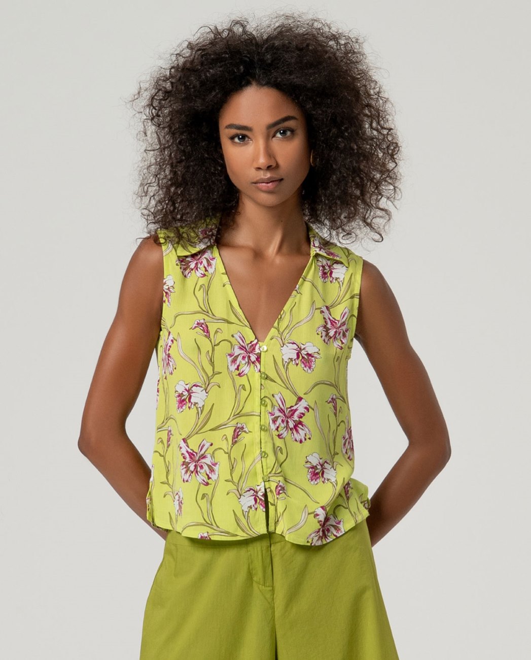 Camisa sem mangas com decote em V e fechamento frontal com botões. Design estampado e corte reto com barra levemente arredondada. Feito de tecido leve com queda fluida. Projetado em Barcelona.