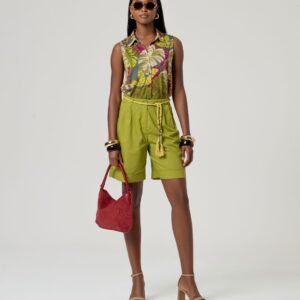 Camisa sem mangas com gola e fechamento de botão na frente. Design de silhueta reta com barra levemente arredondada e estampa floral distribuída por toda a peça. Feito de viscose leve e tecido de poliamida. Feito de tecido Lyocell leve com queda fluida