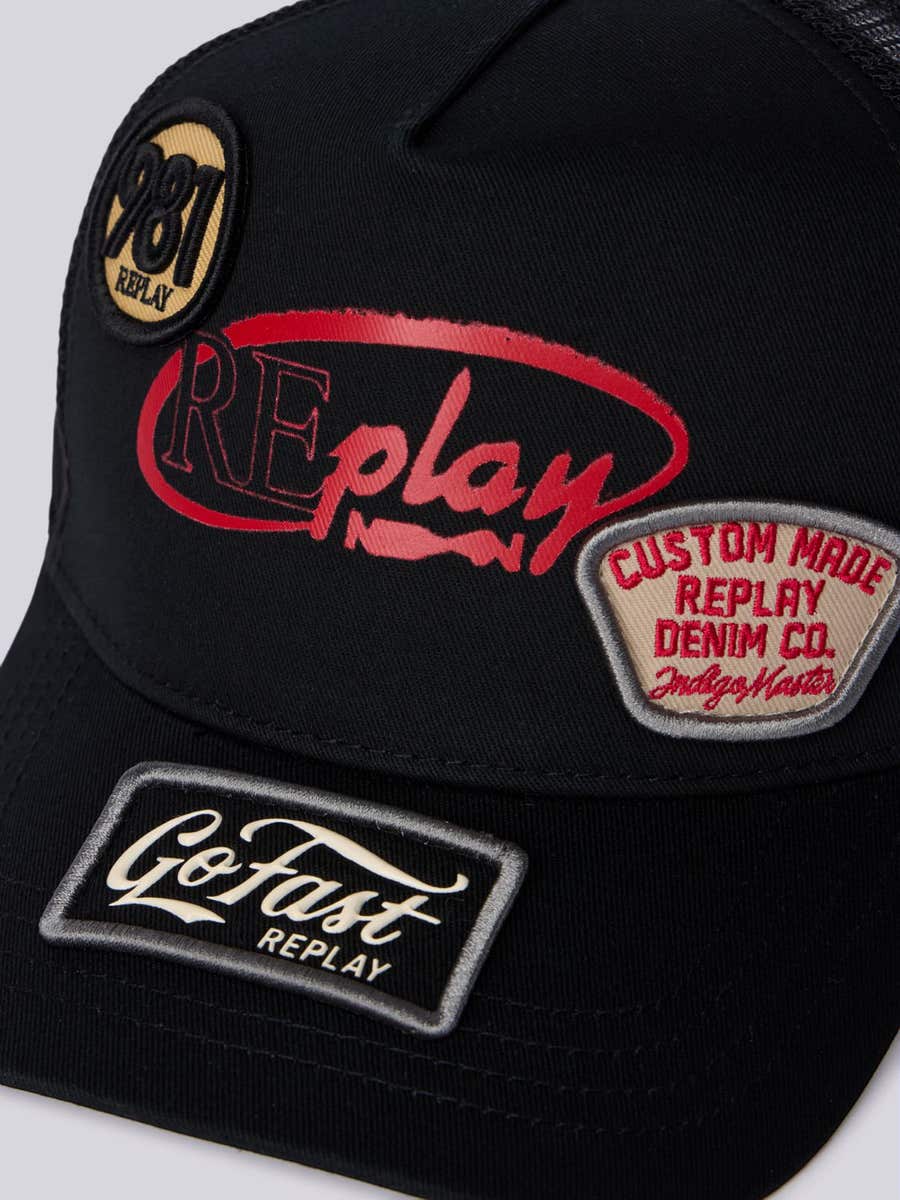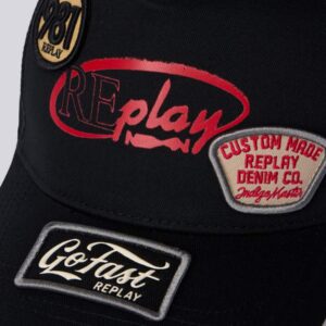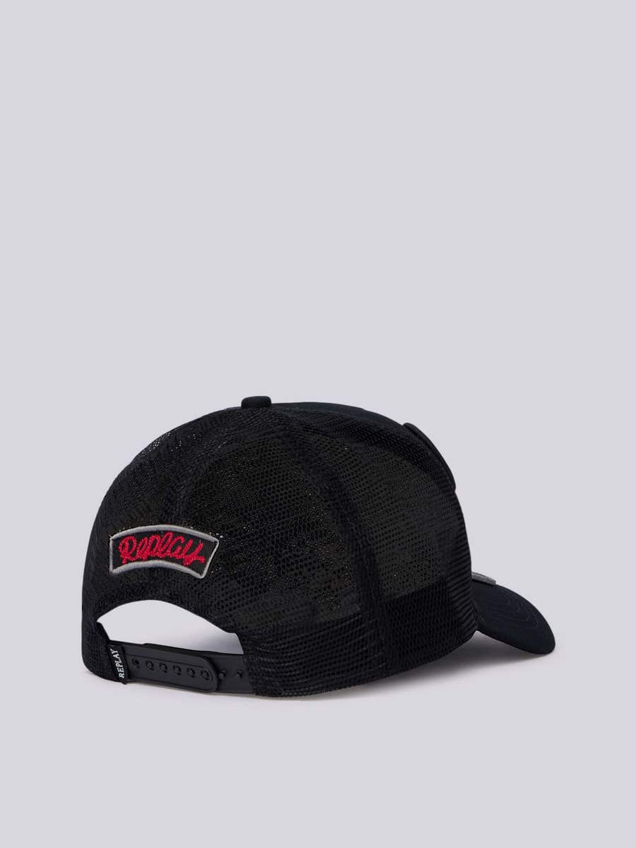 Boné de beisebol em sarja de algodão resistente com aba curva e aplicação de mesh. Este acessório forrado apresenta patches, incluindo um na aba, uma estampa de inspiração vintage na frente e um patch bordado com a inscrição Replay nas costas. Fecho ajustável com botão de pressão e etiqueta com a bandeira Replay nas costas.