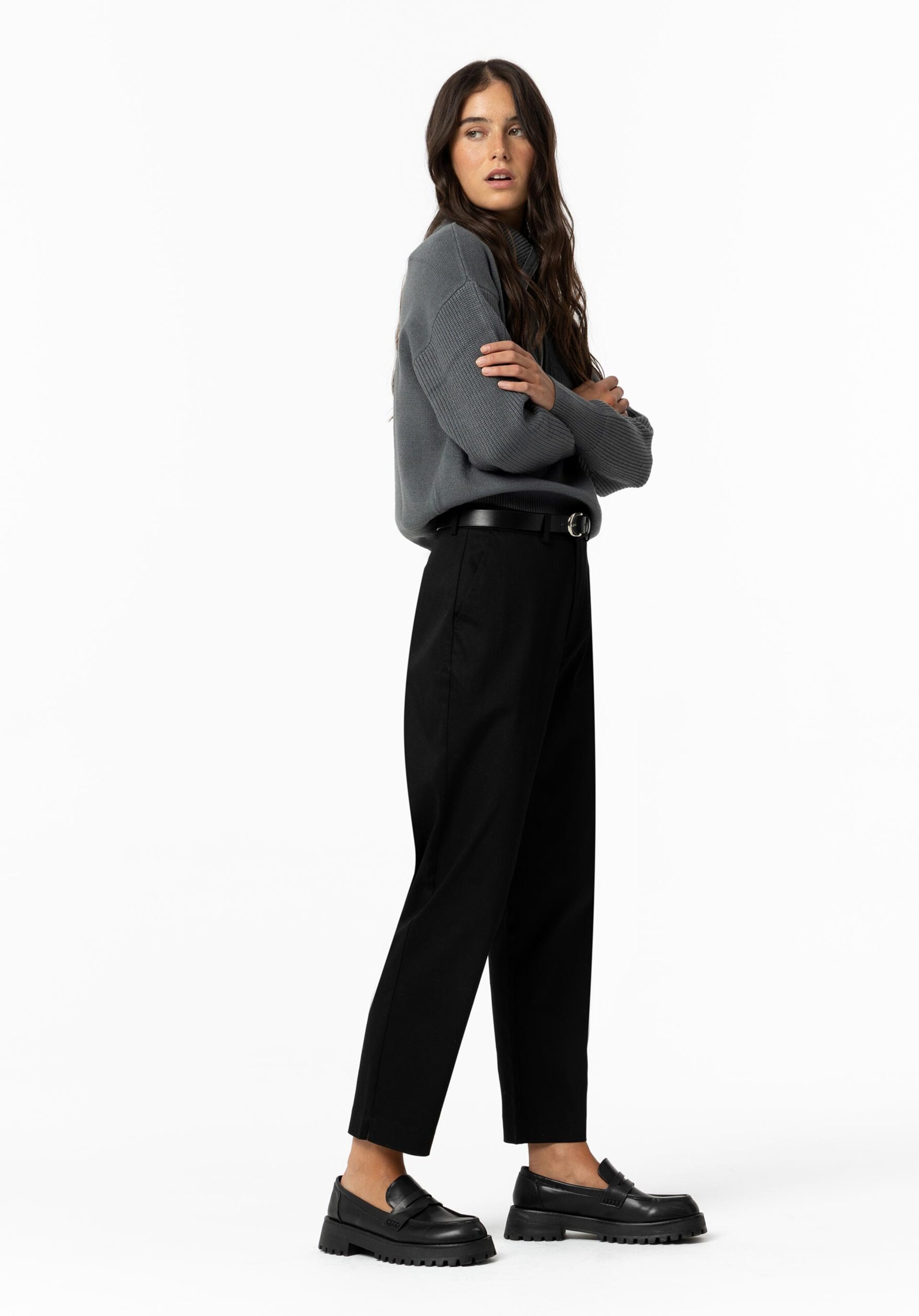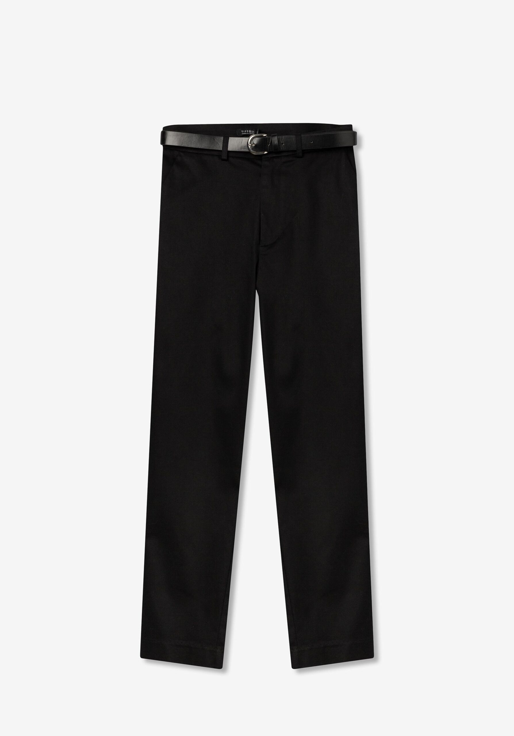 Calças de cintura média com aplicação de cinto efeito pele. Fecho frontal de correr e gancho metálico. Bolsos laterais.
