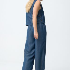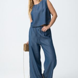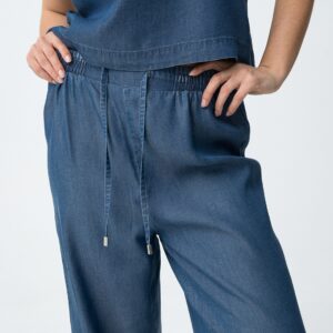 Calças largas de cor azul-escuro, com cintura elástica ajustável e corte descontraído estilo wide leg.