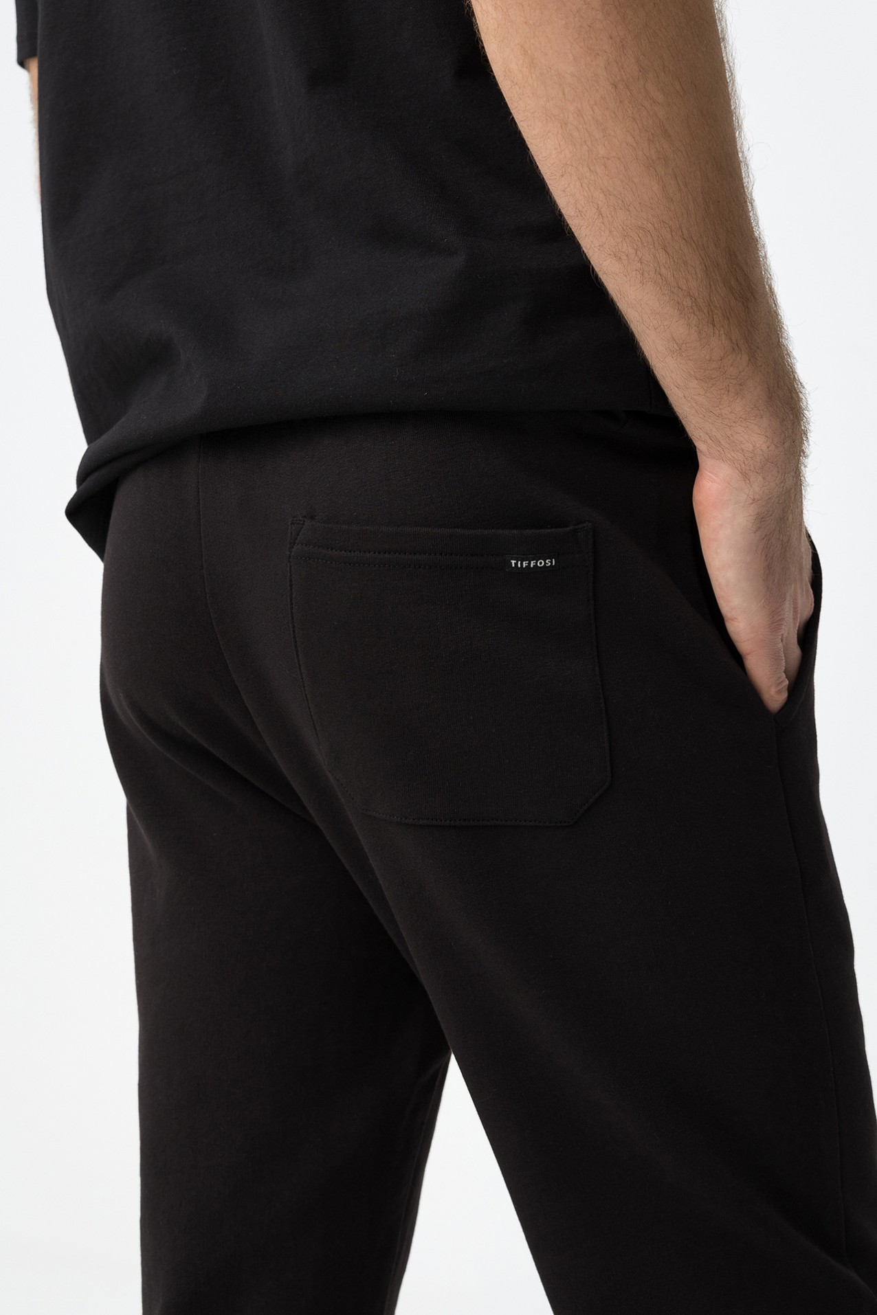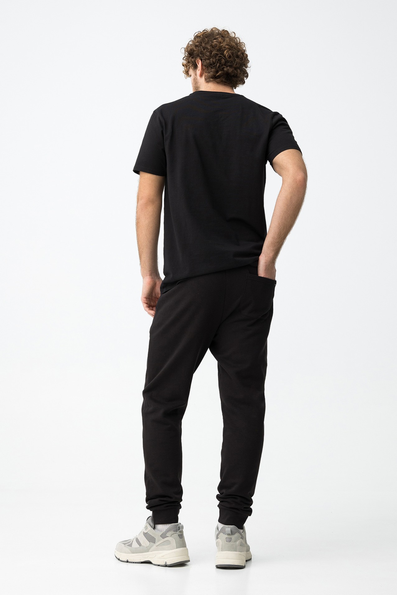 Calças slim fit de cor preta, com cintura elástica e cordão ajustável, num estilo casual.