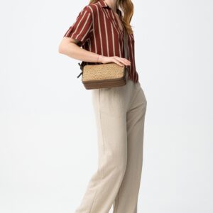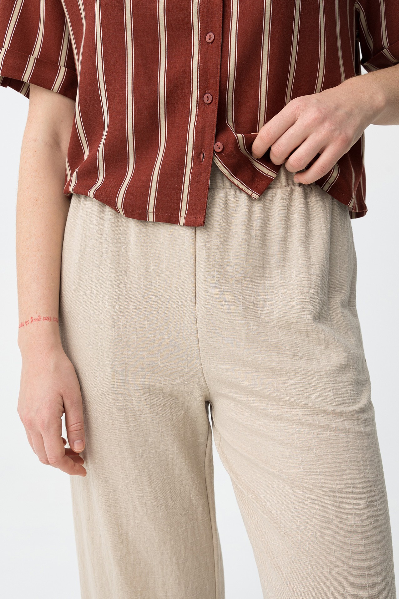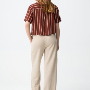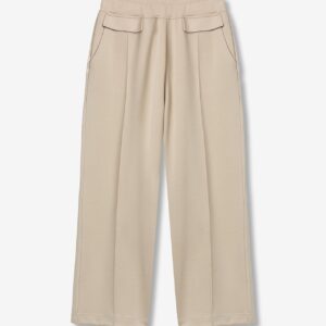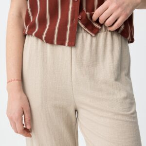 Calças largas em bege, com cintura elástica e corte descontraído para um look casual.