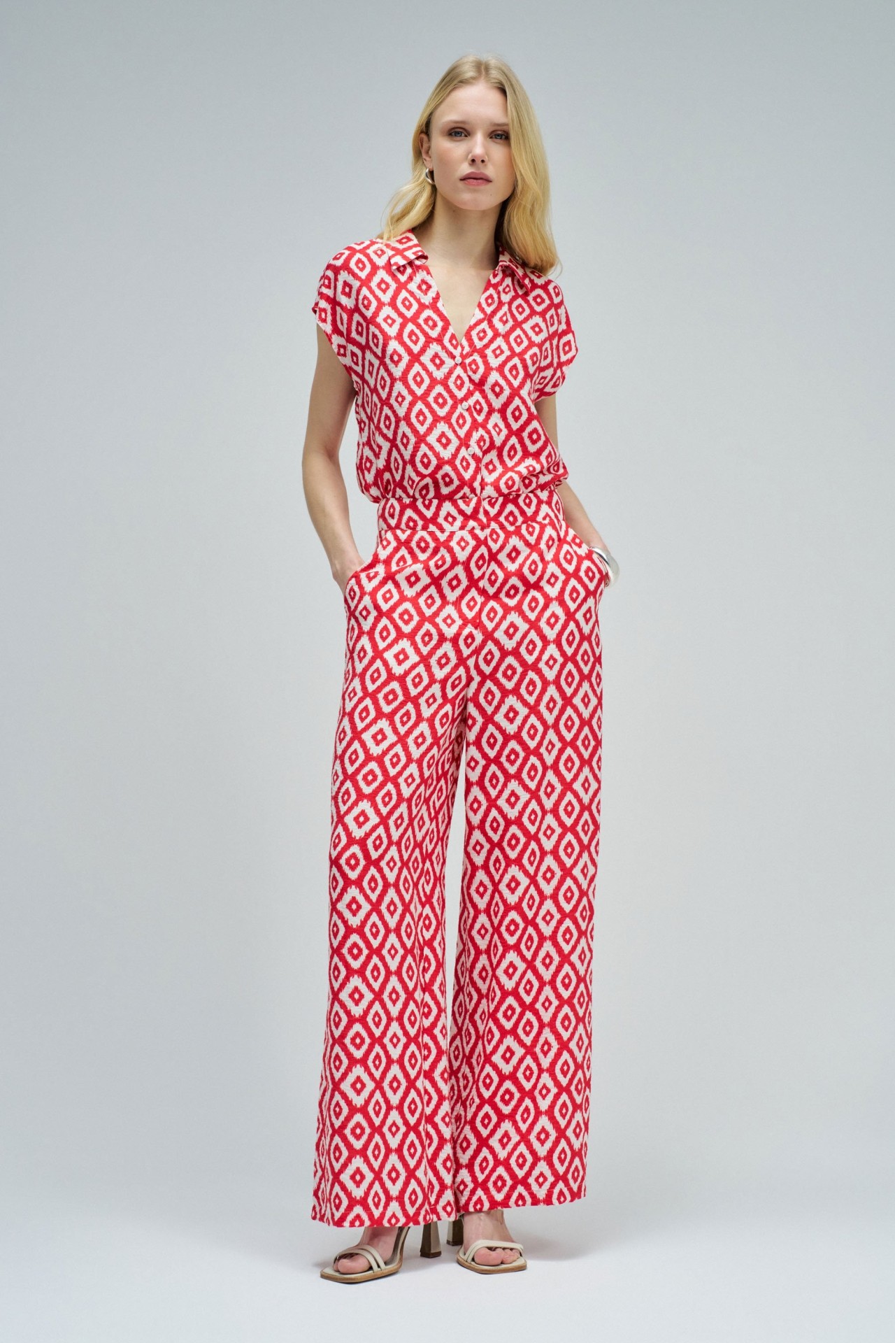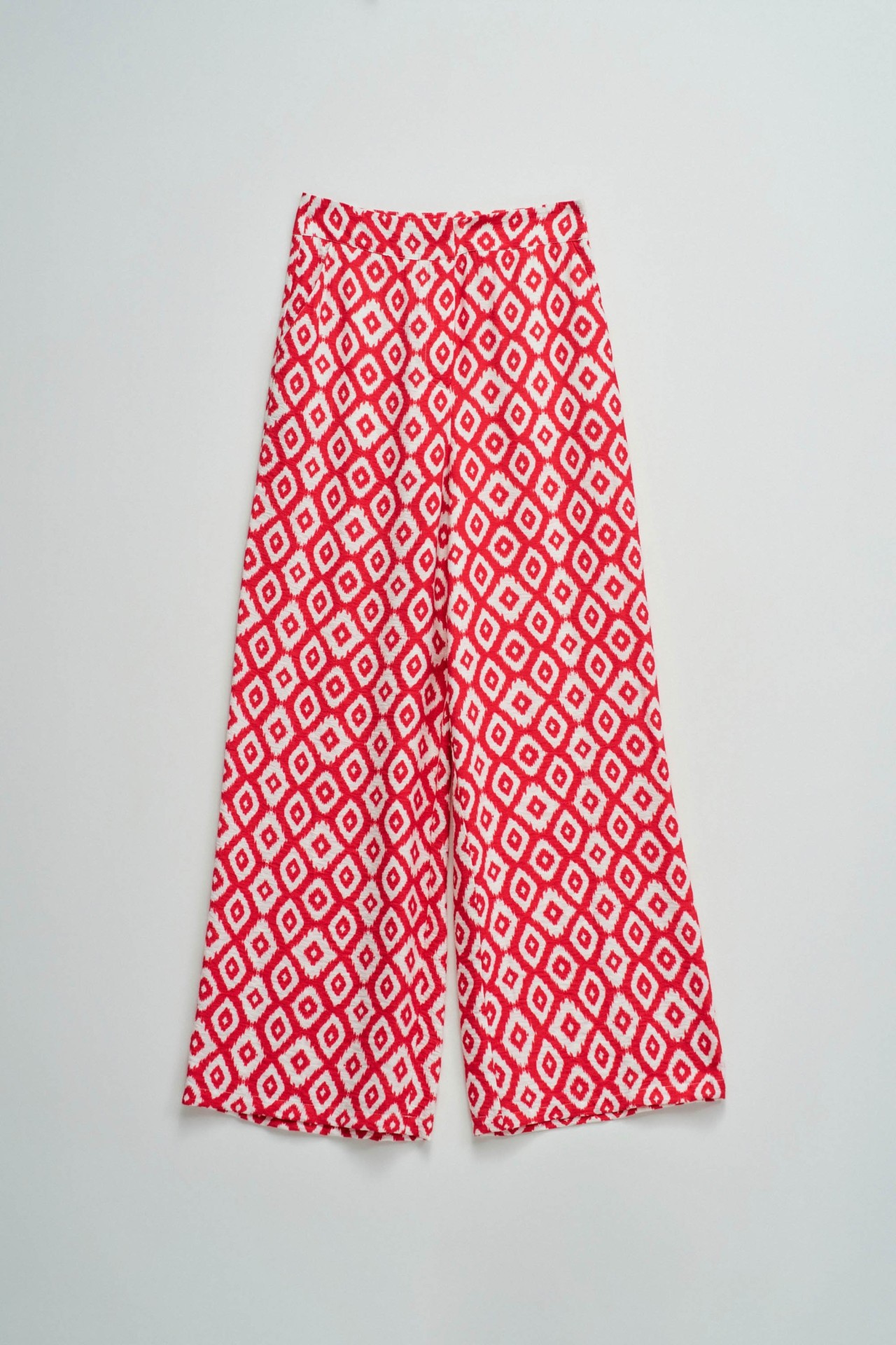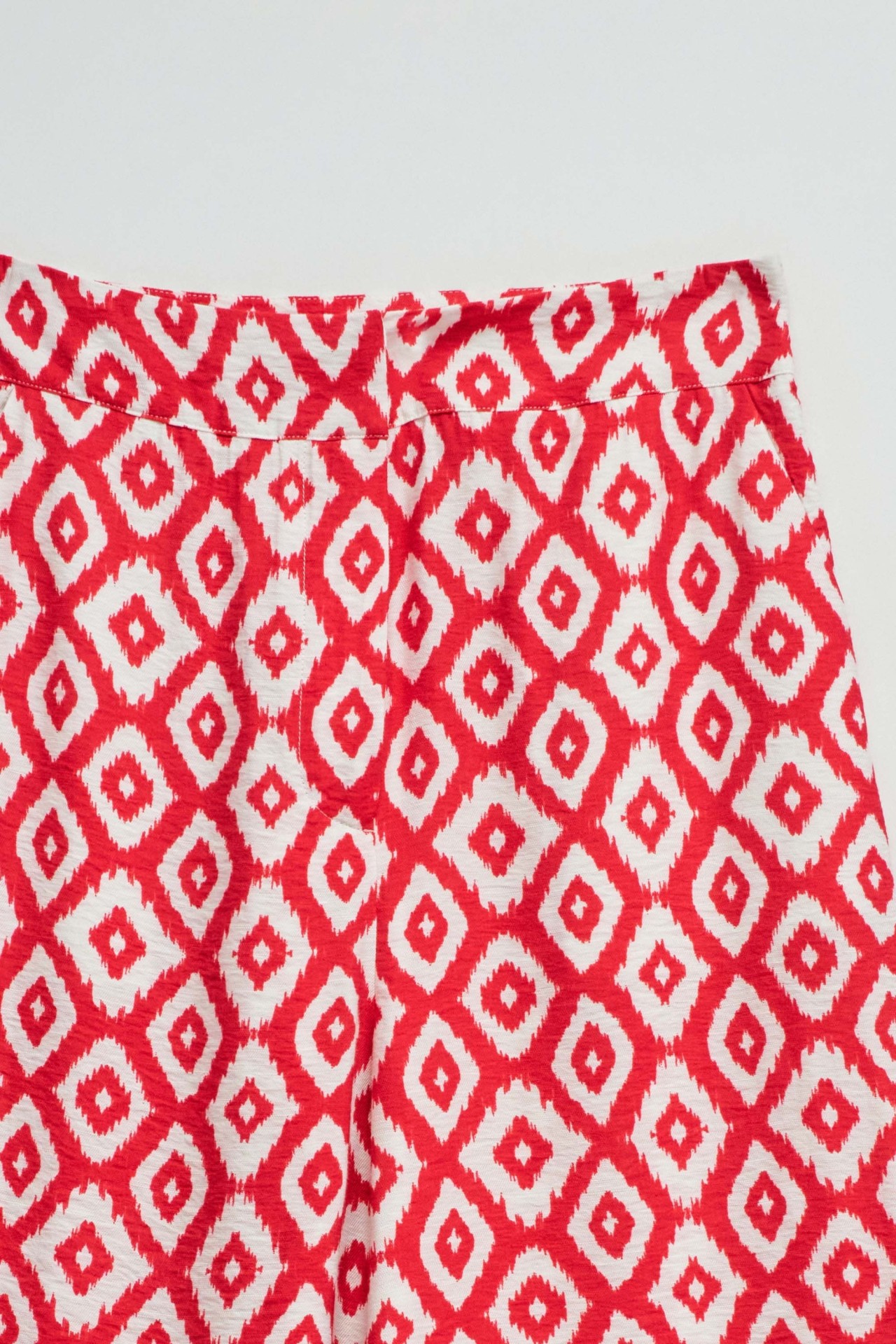 Calças fluídas com padrão que combinam conforto e feminilidade. Apresentam um delicado mix de cores em vermelho e branco, perfeito para looks leves e sofisticados. O corte regular garante um caimento natural, enquanto a cintura alta valoriza a silhueta. Dispõem de dois bolsos funcionais e abertura frontal com fecho de correr e botões de gancho, assegurando um ajuste prático e seguro. Ideais para coordenar com blusas lisas ou camisas para um visual elegante e descontraído.