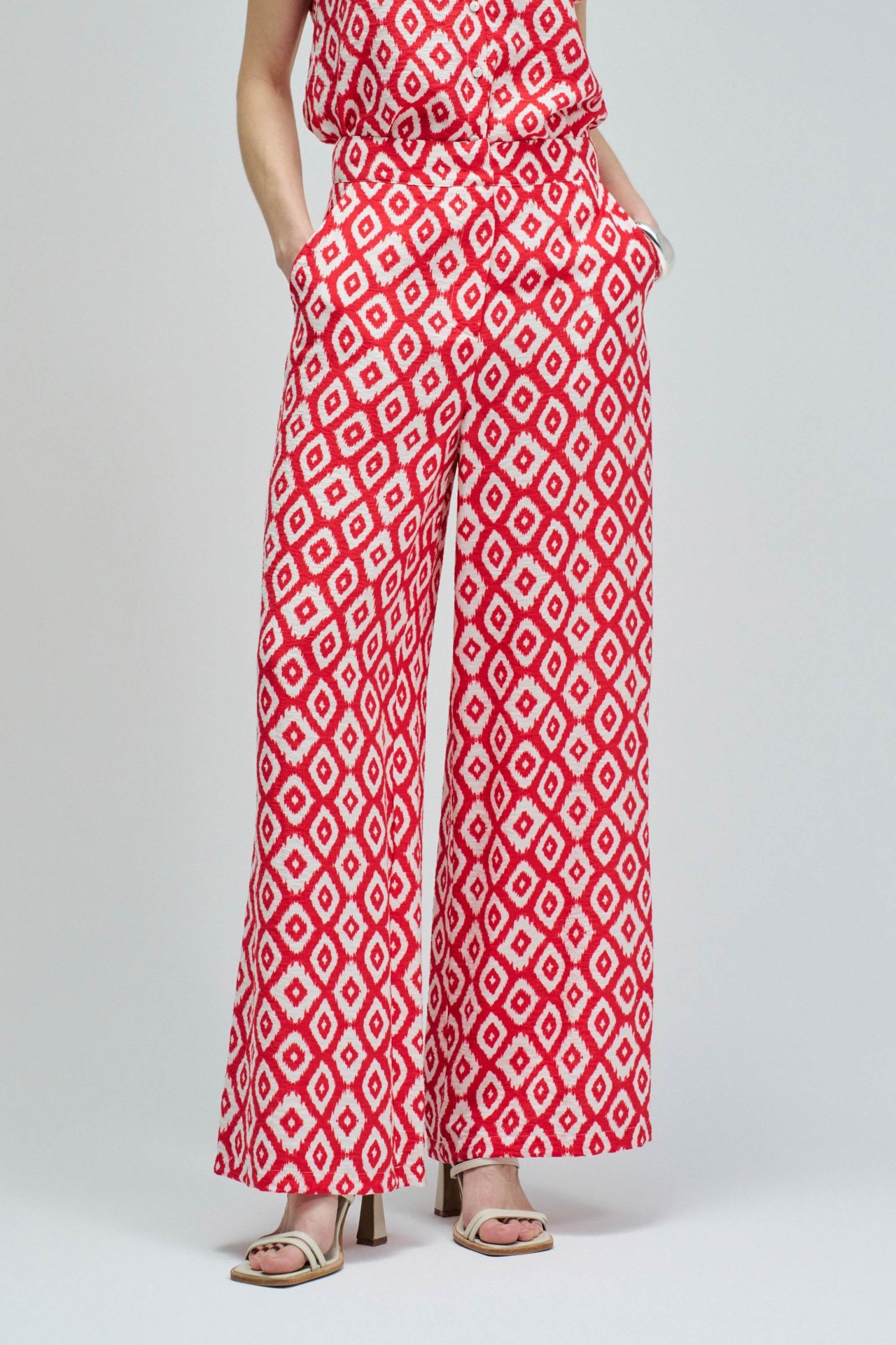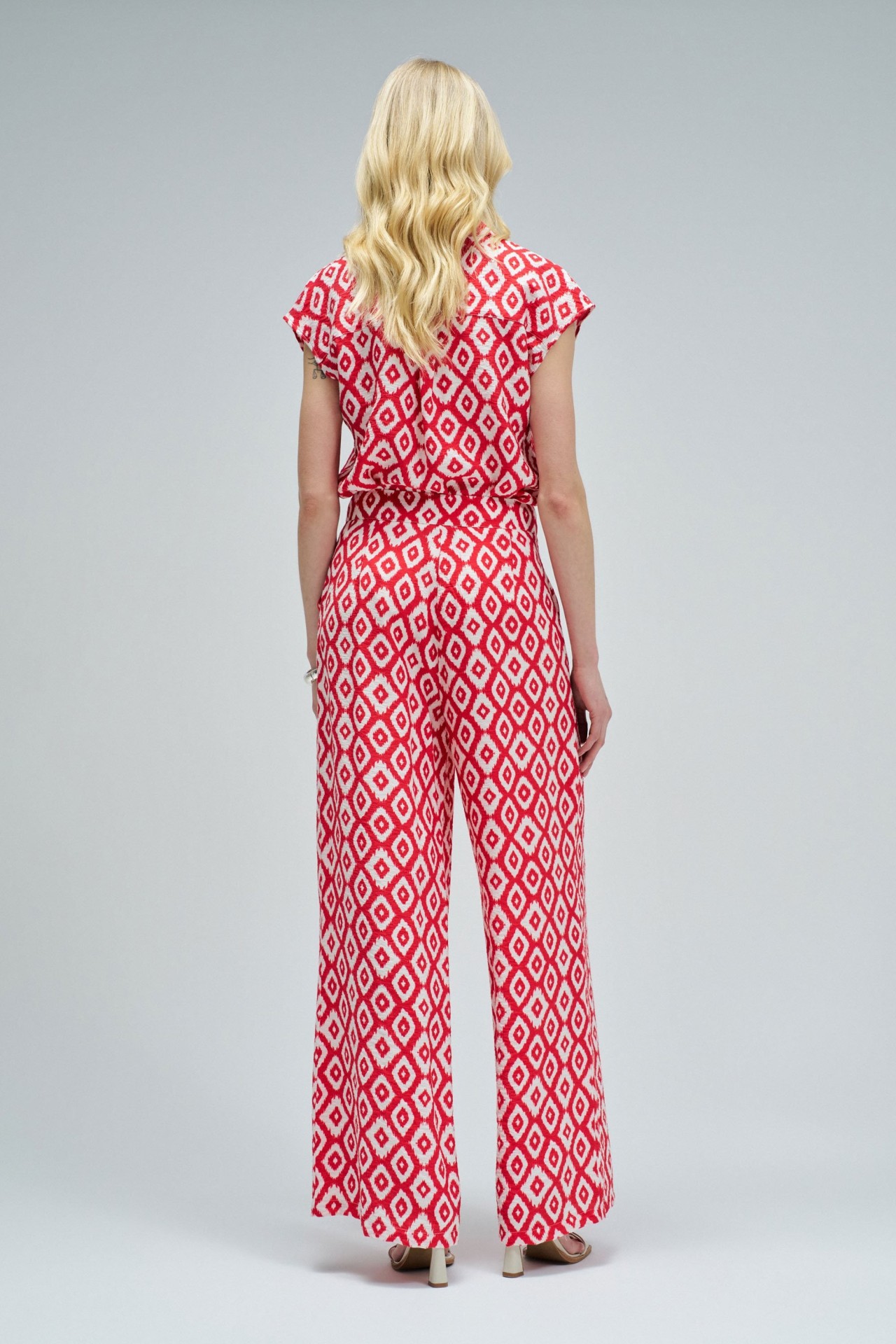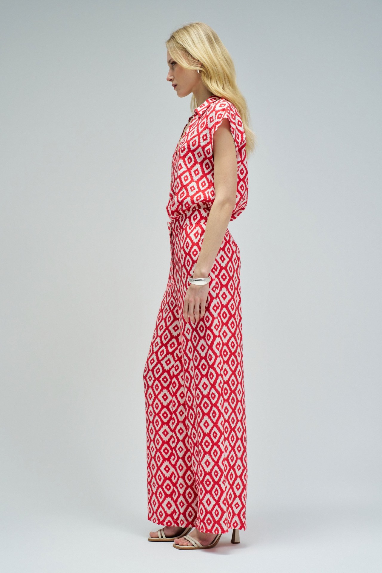 Calças fluídas com padrão que combinam conforto e feminilidade. Apresentam um delicado mix de cores em vermelho e branco, perfeito para looks leves e sofisticados. O corte regular garante um caimento natural, enquanto a cintura alta valoriza a silhueta. Dispõem de dois bolsos funcionais e abertura frontal com fecho de correr e botões de gancho, assegurando um ajuste prático e seguro. Ideais para coordenar com blusas lisas ou camisas para um visual elegante e descontraído.