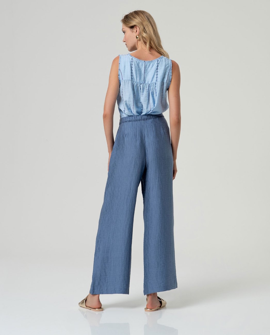 Calças longas com cintura média e silhueta reta. Design com fechamento frontal com botão e zíper, e comprimento reto da perna até o tornozelo. Feito de tecido com viscose, lyocell e poliamida. Projetado em Barcelona.