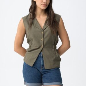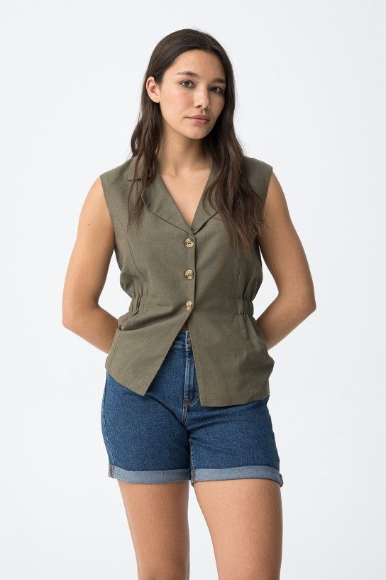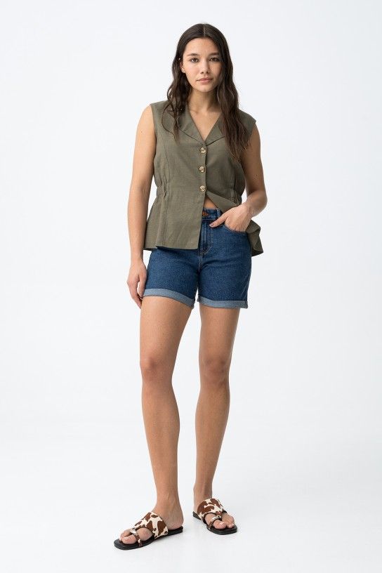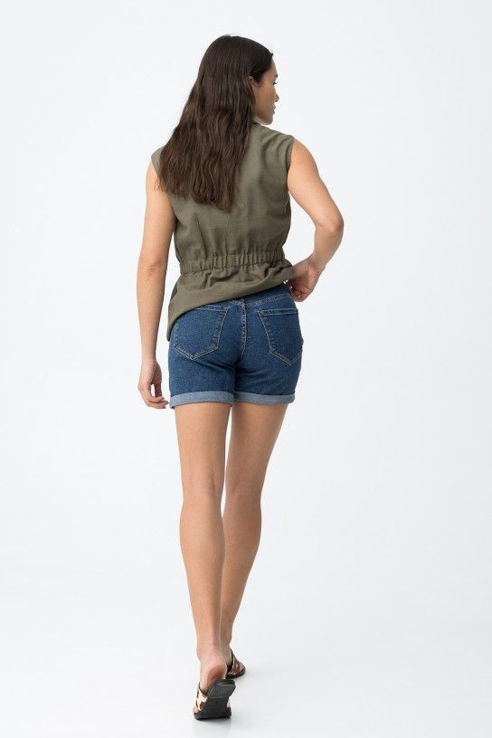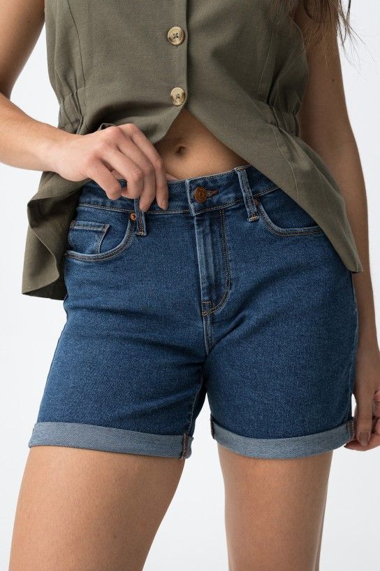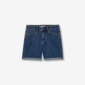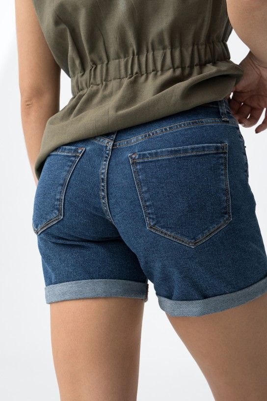 Calções de ganga em azul escuro, corte reto, bolsos à frente e atrás, acabamento dobrado na bainha.