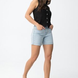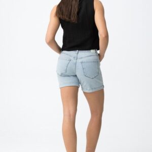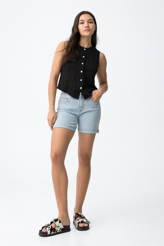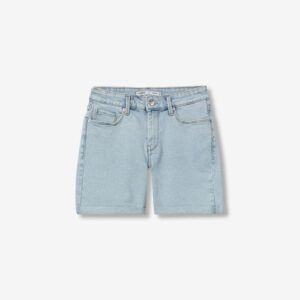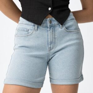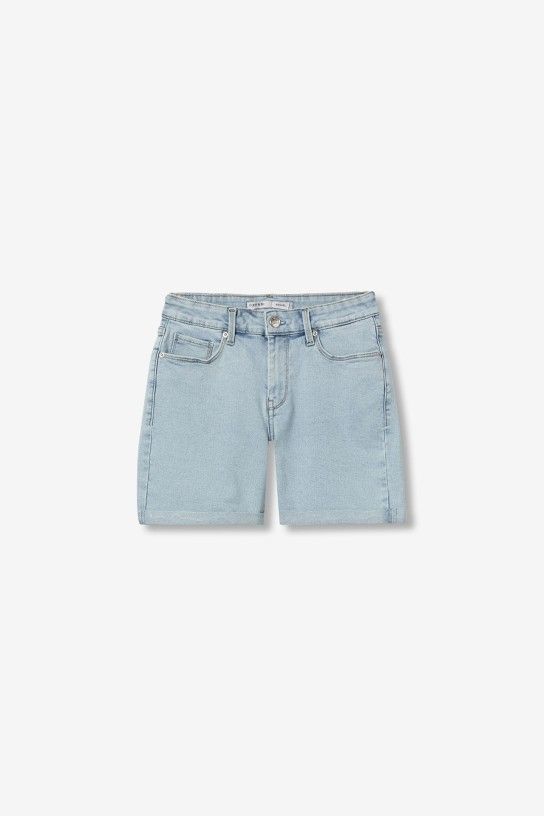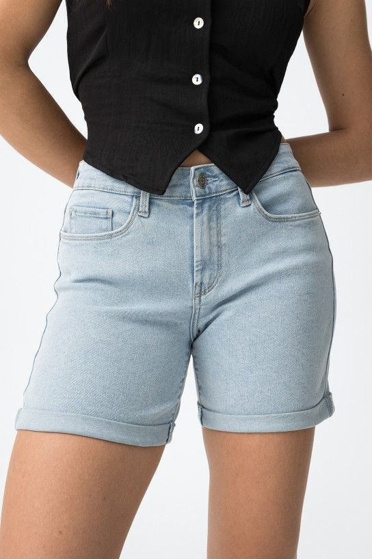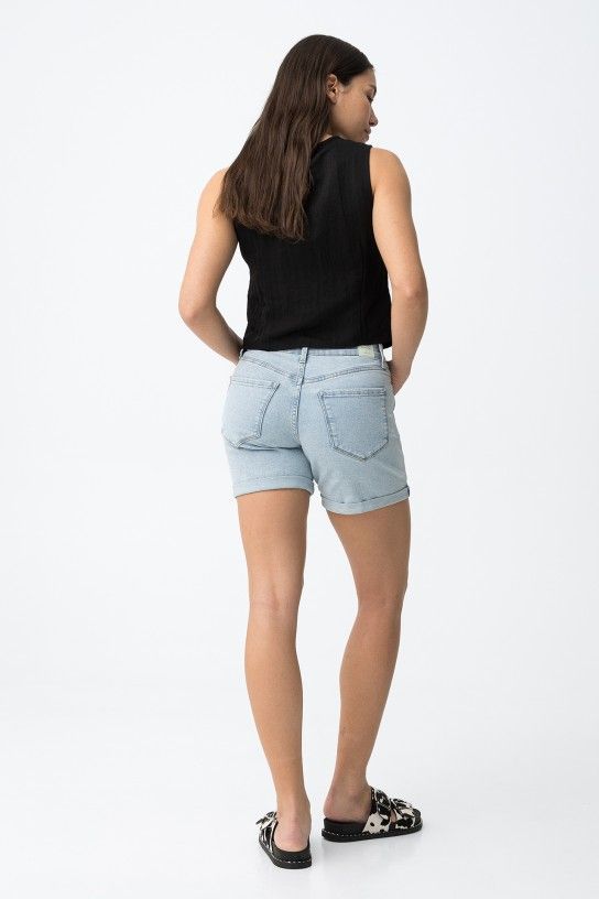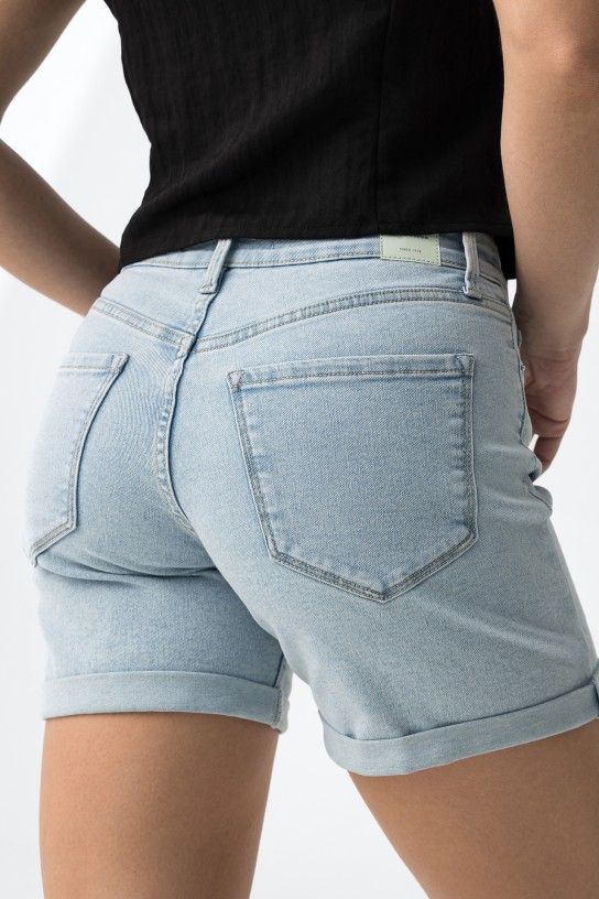 Calção curto de corte justo, com bolsos à frente e atrás, num tom azul claro super casual.