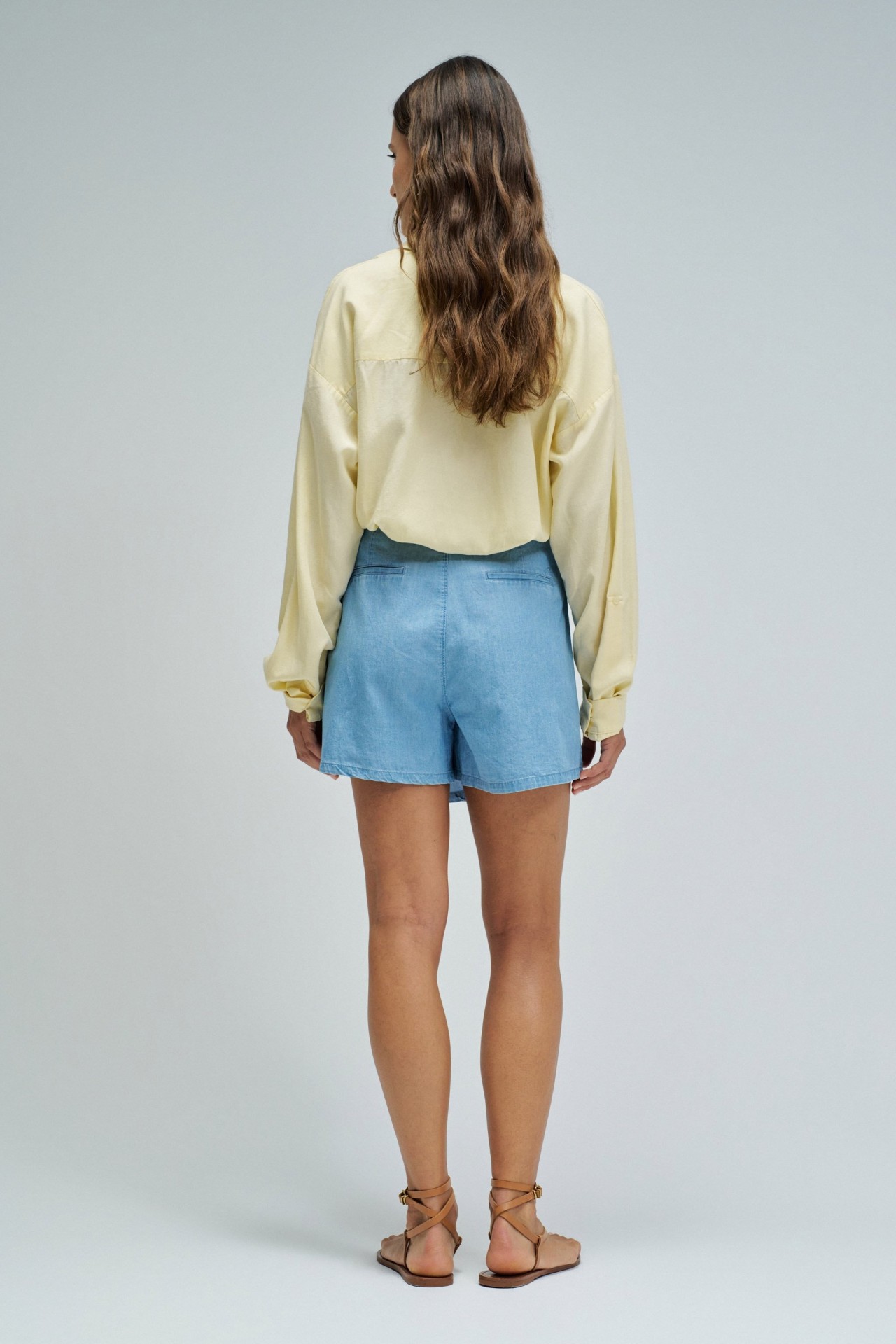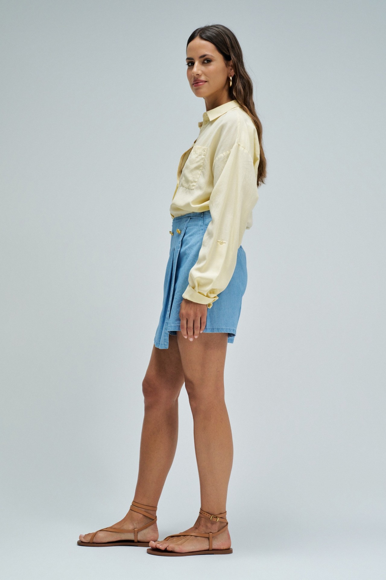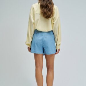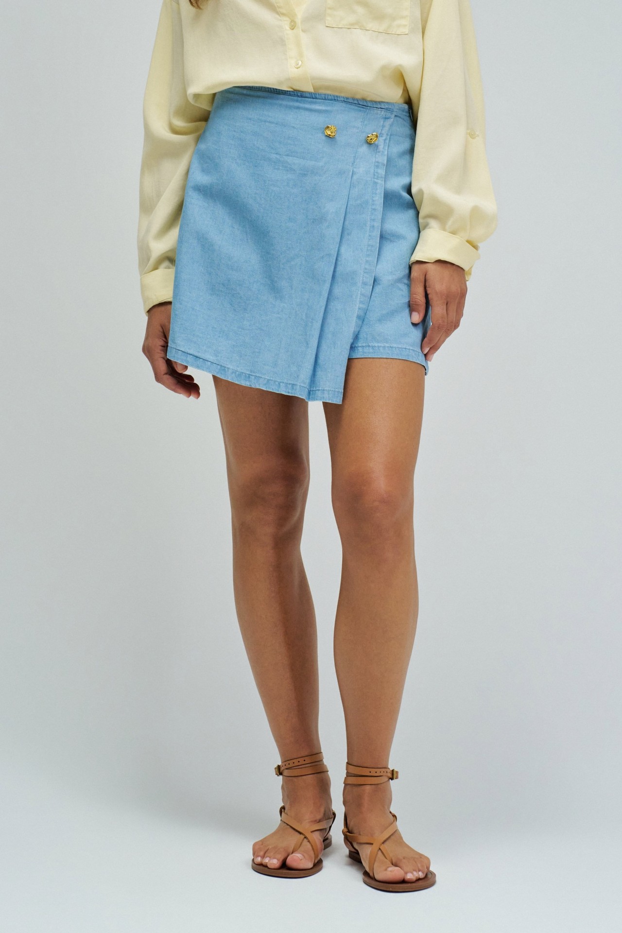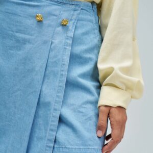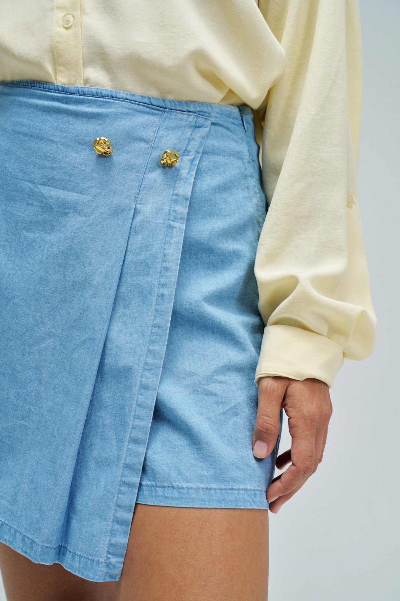 Skort em lightdenim azul, com cintura alta e fit regular, que alia a estética de saia à funcionalidade de calções. O trespasse frontal com botão de mola confere um toque contemporâneo, enquanto a abertura lateral com fecho de correr facilita o vestir. Destaca-se ainda pelos bolsos traseiros não funcionais e pela aplicação metálica dourada com branding, que acrescenta um detalhe sofisticado.