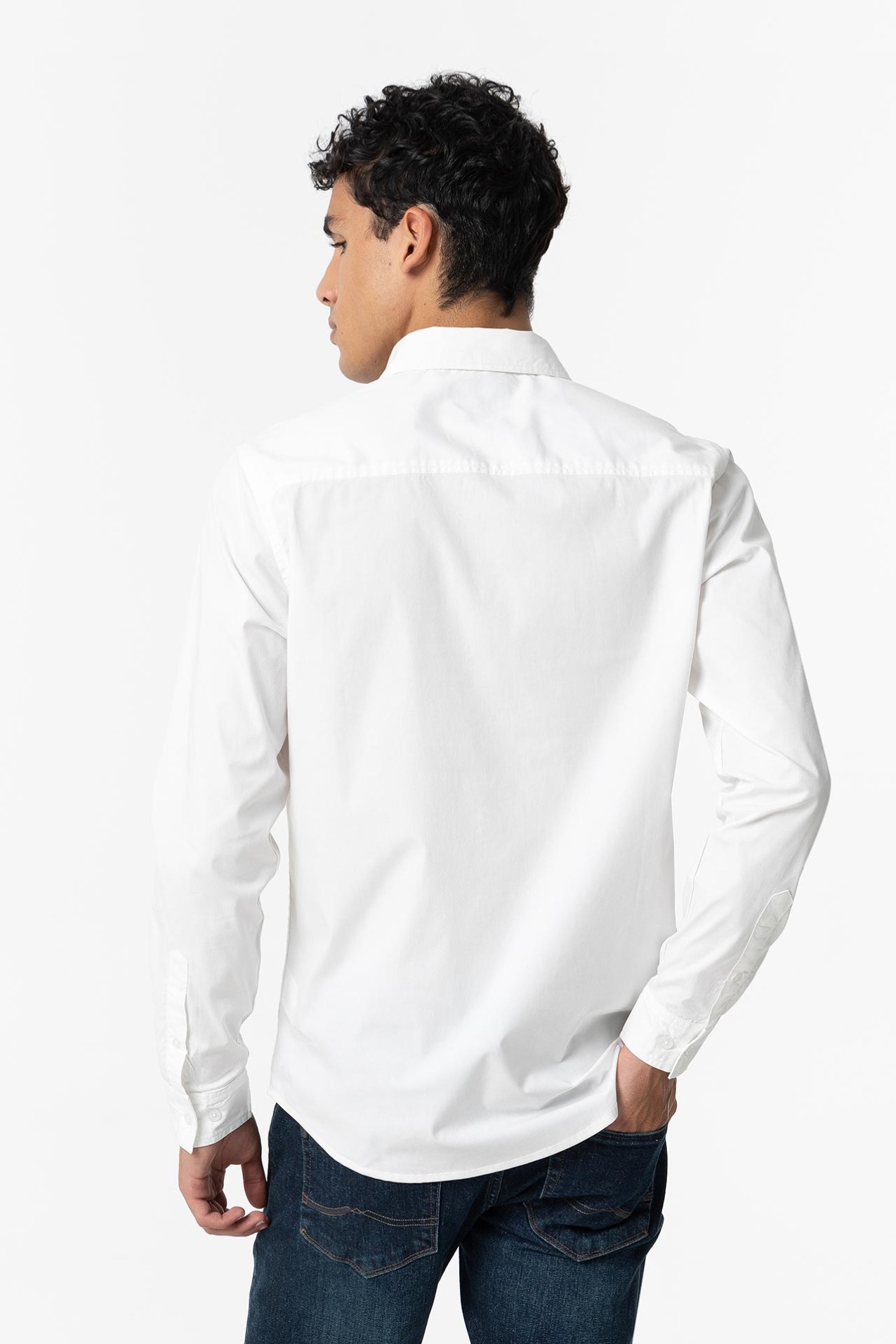 Camisa com colarinho de aba com botões e manga comprida. Fecho frontal de botões.