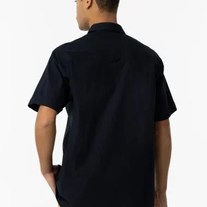 Camisa de manga curta com acabamento em dobra e colarinho de abas. Fecho à frente com botões. Bolso frontal com botão.