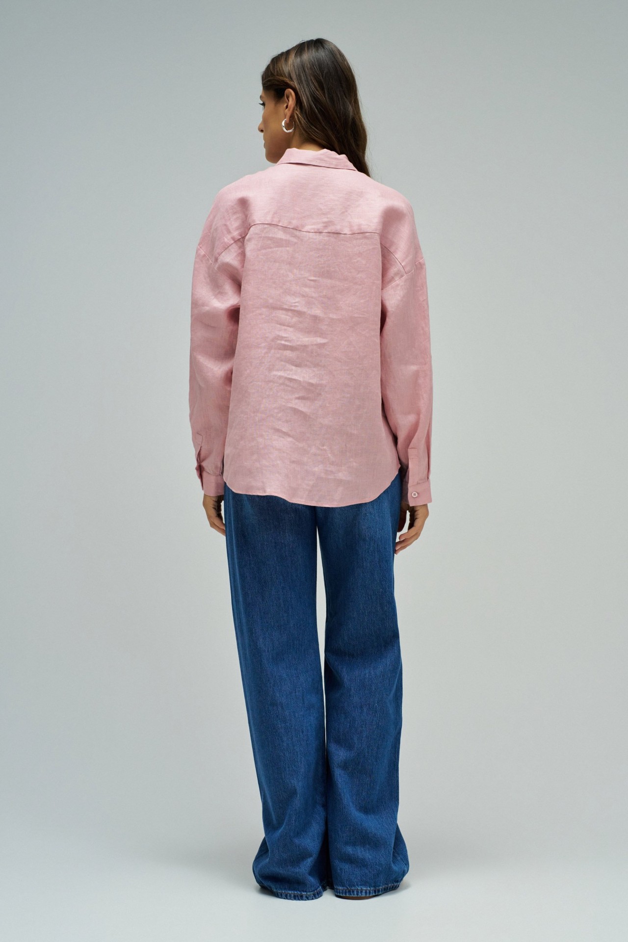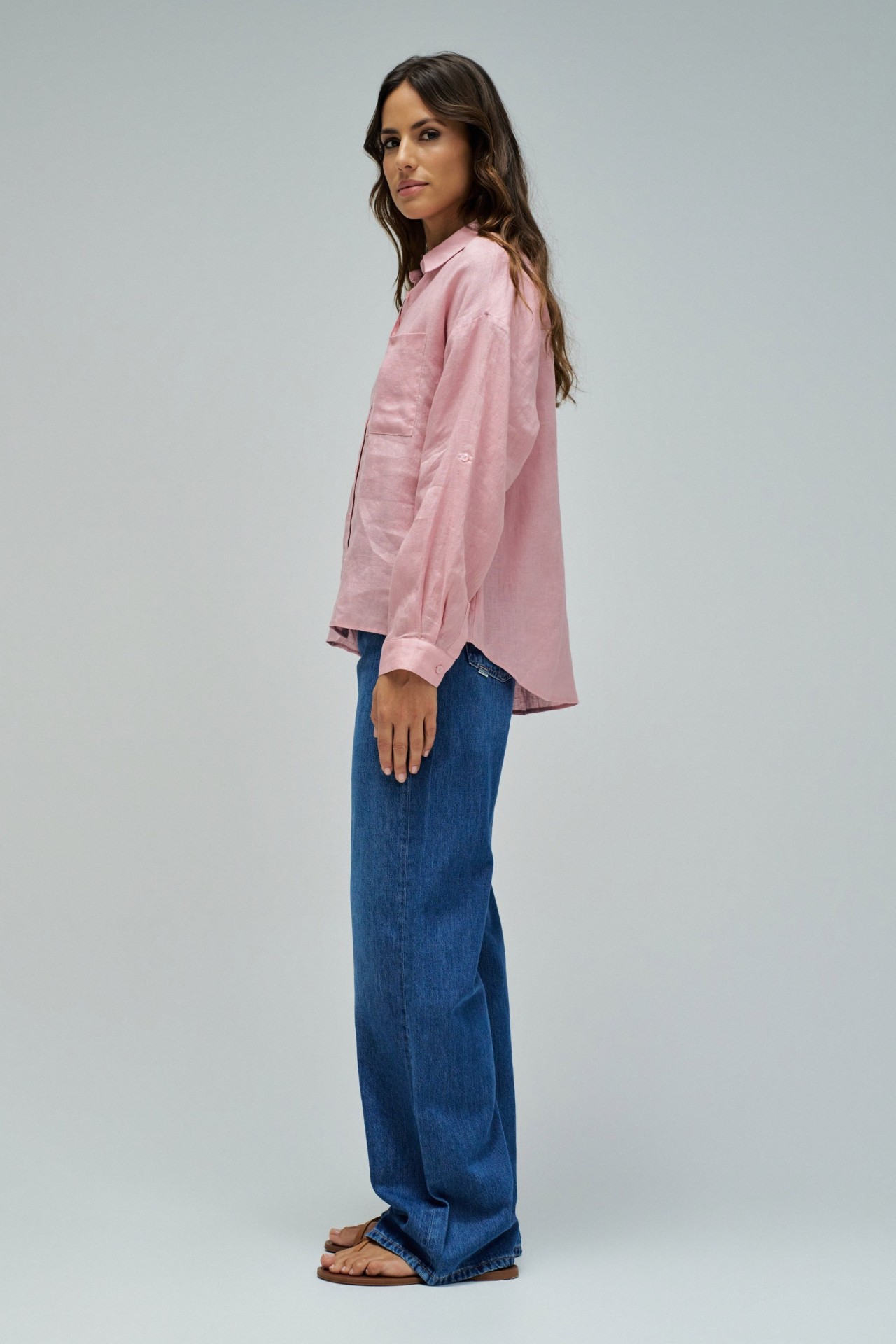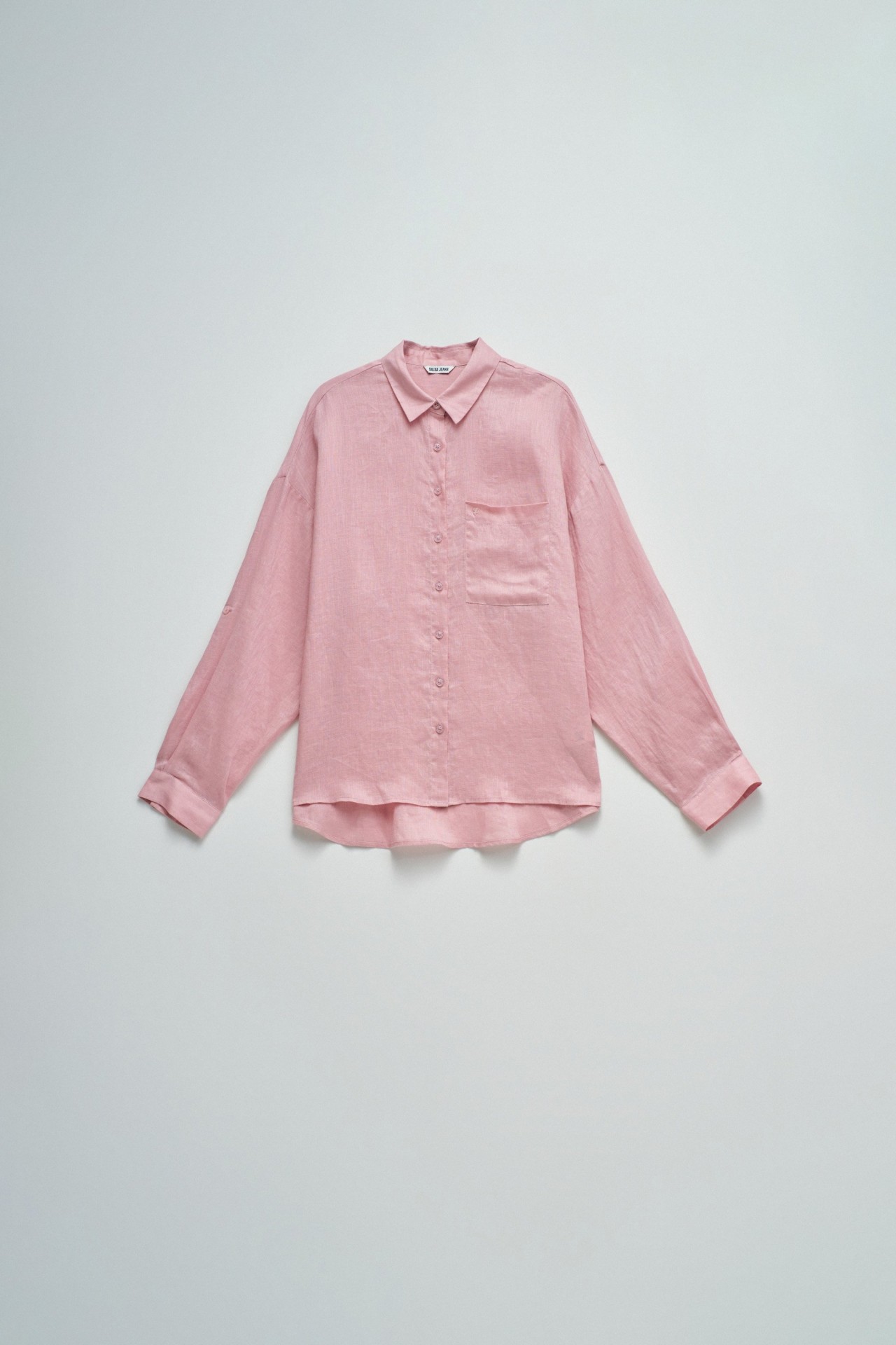 Leve e intemporal, esta camisa de linho em cor rosa destaca-se pelo seu fit loose e pelo conforto natural do tecido. O colarinho clássico, a abertura com botões e o bolso no peito reforçam a sua versatilidade, tornando-a ideal para criar looks descontraídos e elegantes em qualquer ocasião.