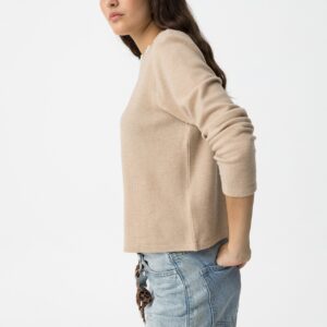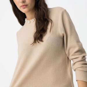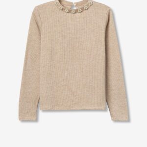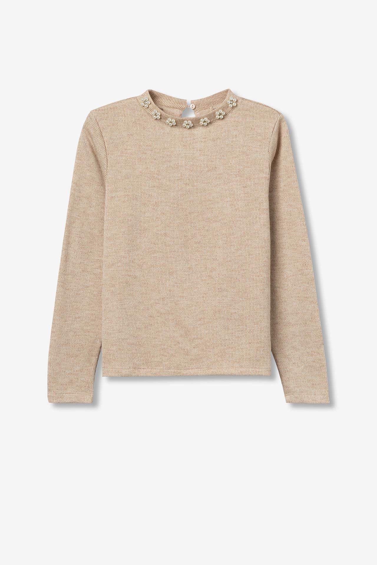 Camisola em malha canelada com gola subida. Detalhe de apliques florais com pérolas no decote. Abertura nas costas com botão.