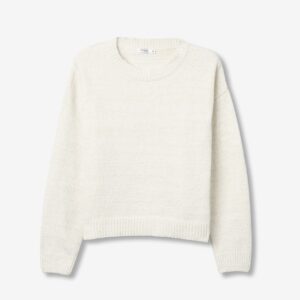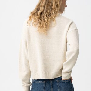 Camisola bege tricotada com corte relaxed, manga comprida e acabamento canelado na bainha.