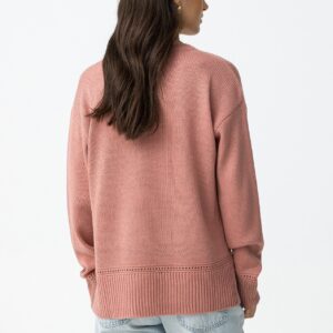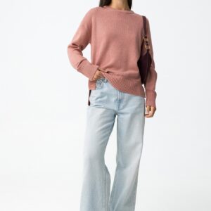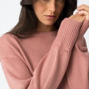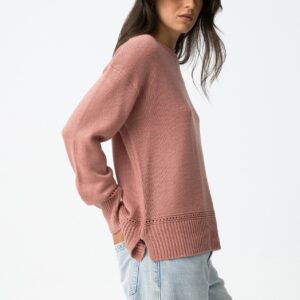 Camisola de manga comprida com gola redonda. Gola, punhos e bainha em rib. Detalhes perfurados na frente e punhos. Corte assimétrico atrás.