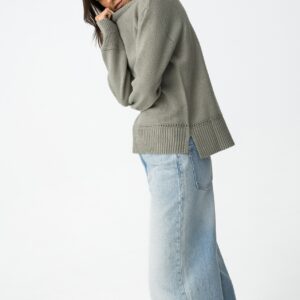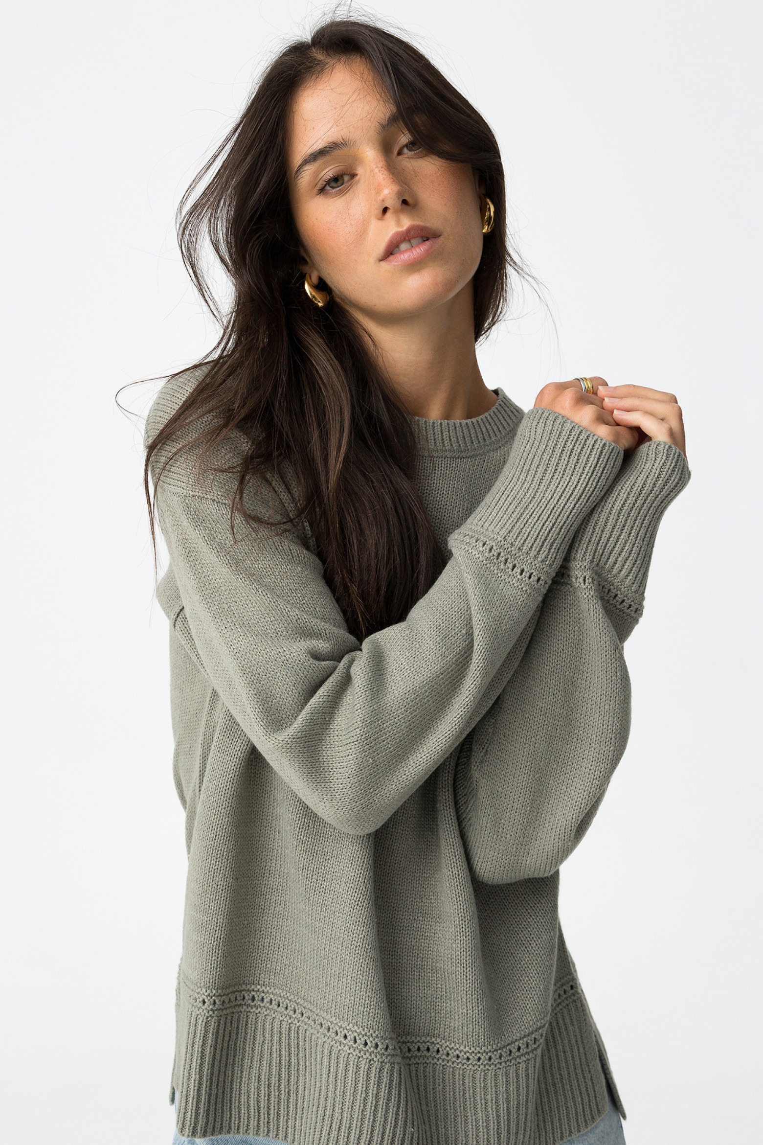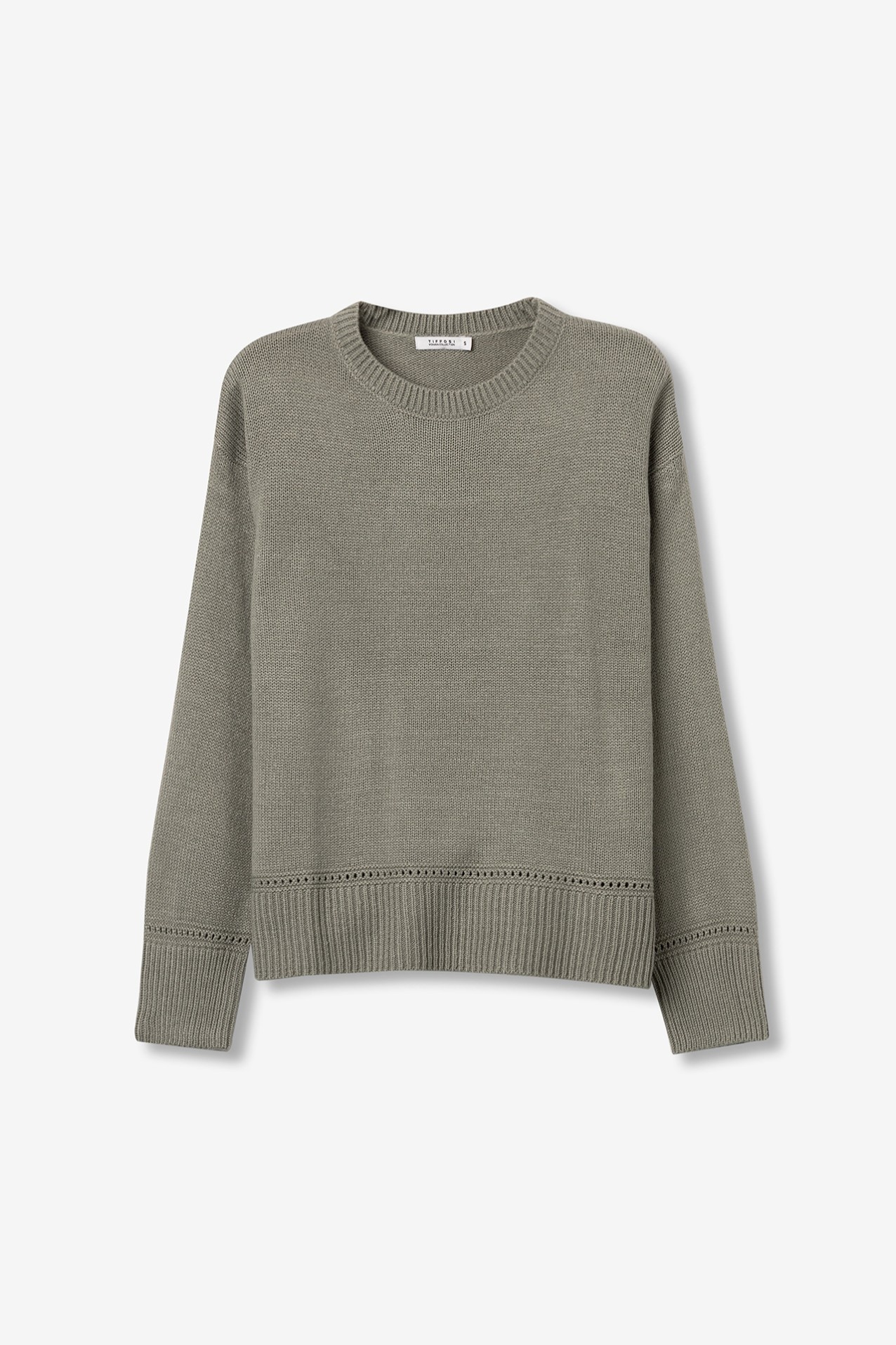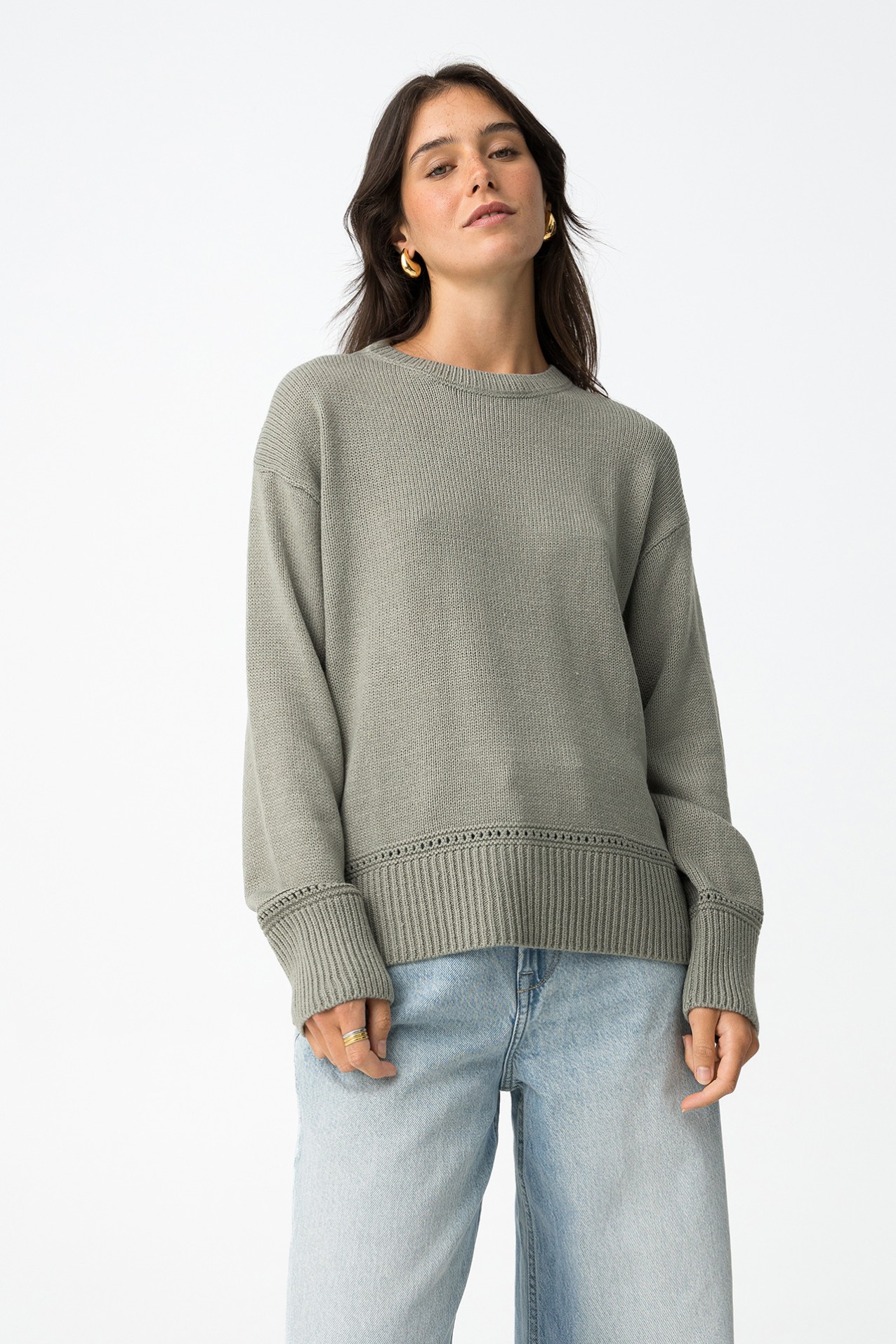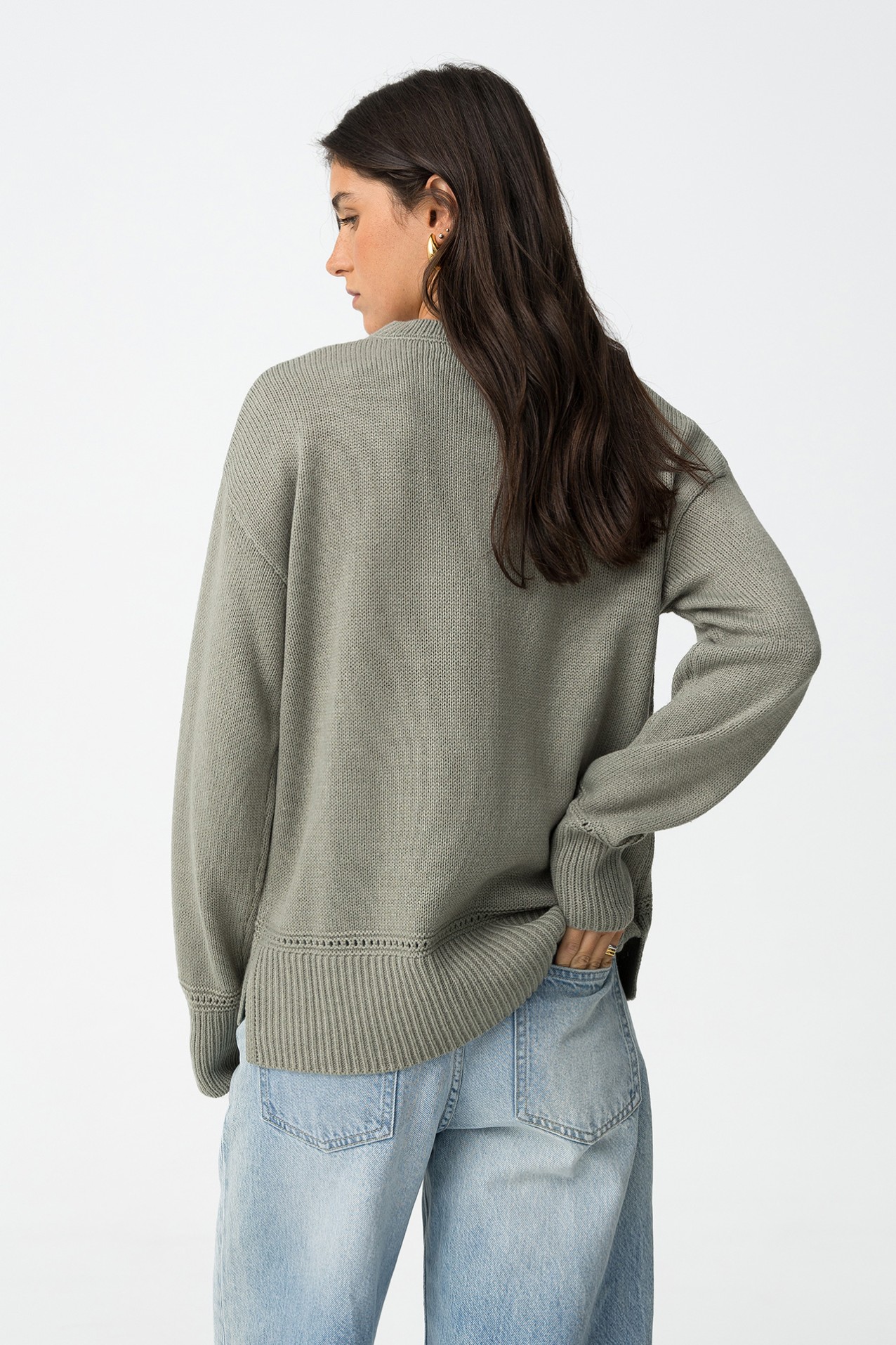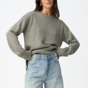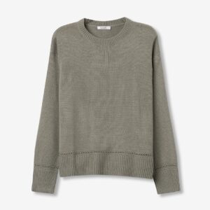 Camisola de manga comprida com gola redonda. Gola, punhos e bainha em rib. Detalhes perfurados na frente e punhos. Corte assimétrico atrás.