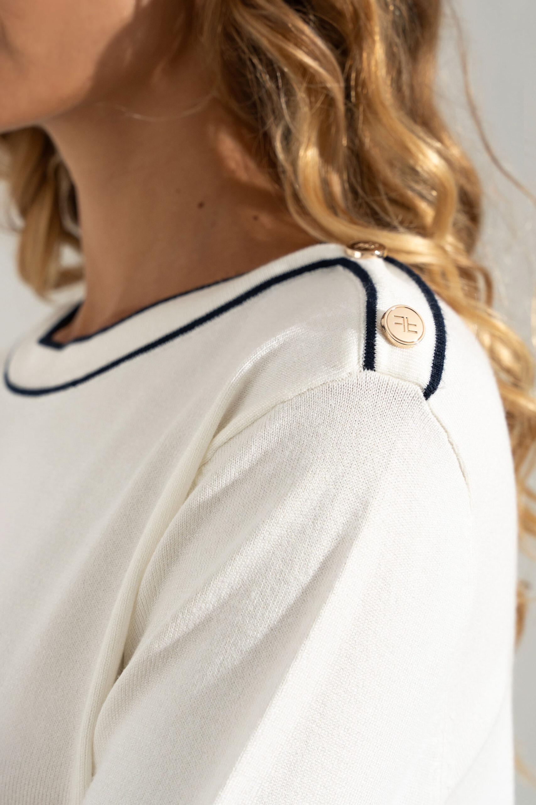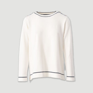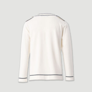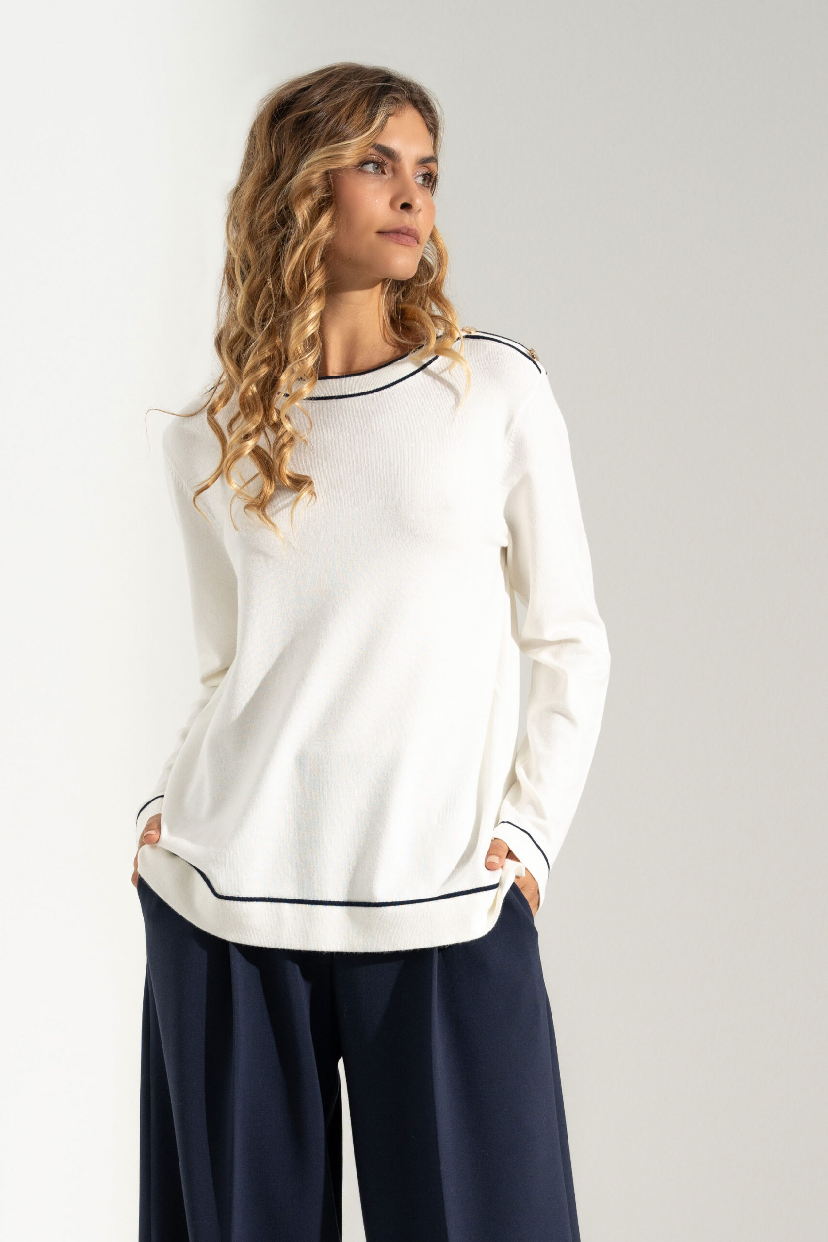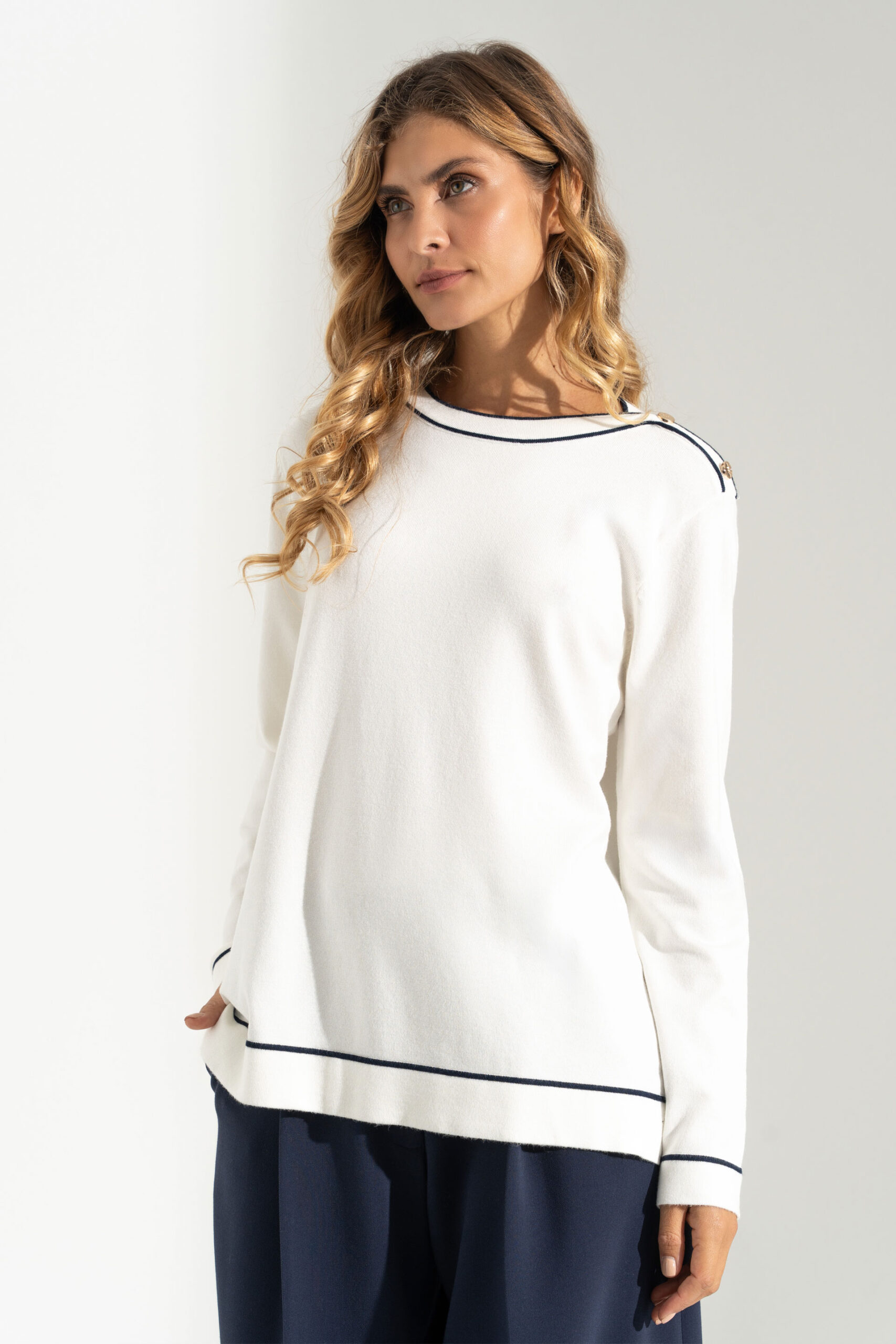 Camisola feminina em malha suave, de corte direito e confortável. Destaca-se pelos botões decorativos nos ombros, que acrescentam um toque elegante e moderno ao design minimalista. Apresenta manga comprida e acabamento em contraste subtil na gola, punhos e bainha. Uma peça versátil, ideal para looks casuais refinados ou coordenados mais sofisticados.