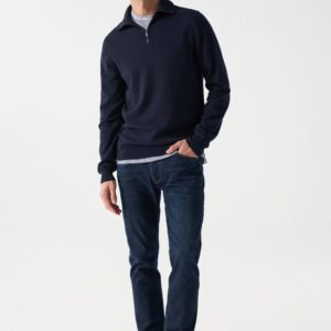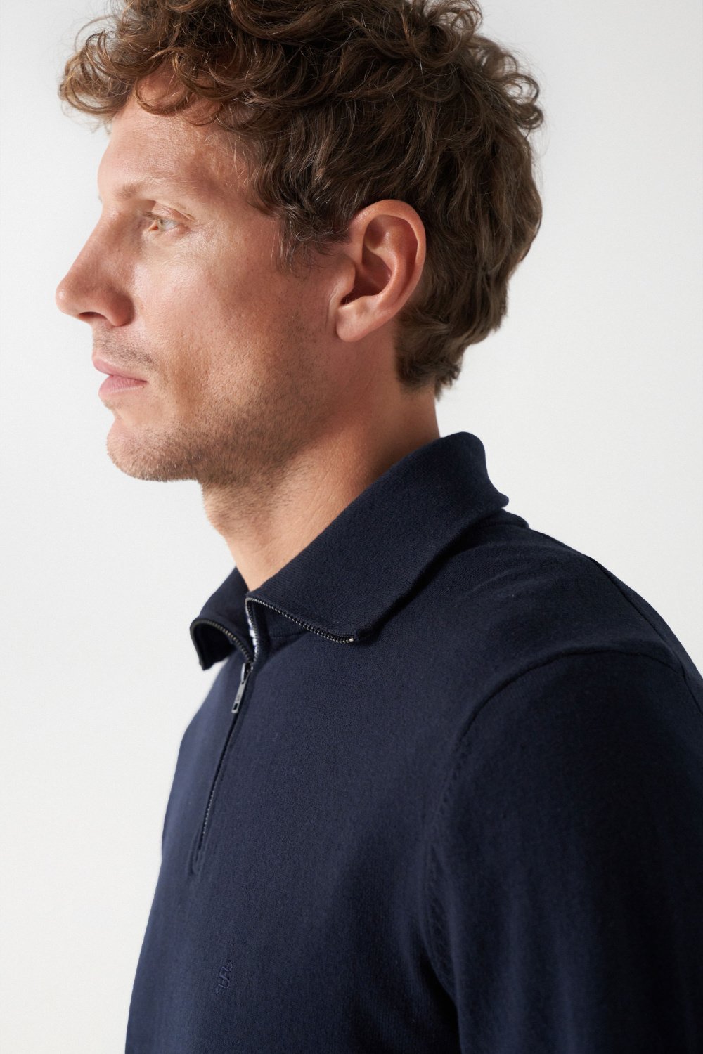 Camisola de malha. Cor azul. Fit Regular. Decote colarinho com fecho. Punhos canelados. Detalhe de branding.