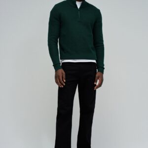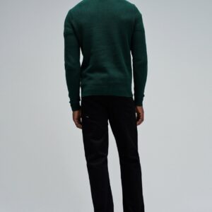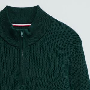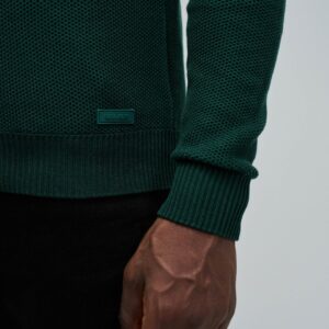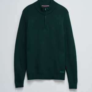 Camisola de malha em verde, com corte regular e um estilo casual sofisticado. Apresenta gola alta com meio fecho, mangas compridas rematadas com punhos canelados e detalhe de branding, acrescentando um toque distinto. Uma peça confortável e versátil, perfeita para o dia a dia.