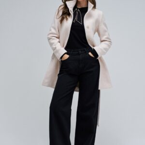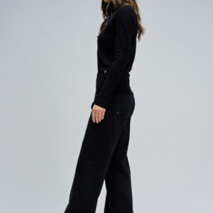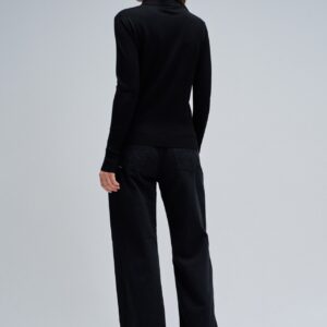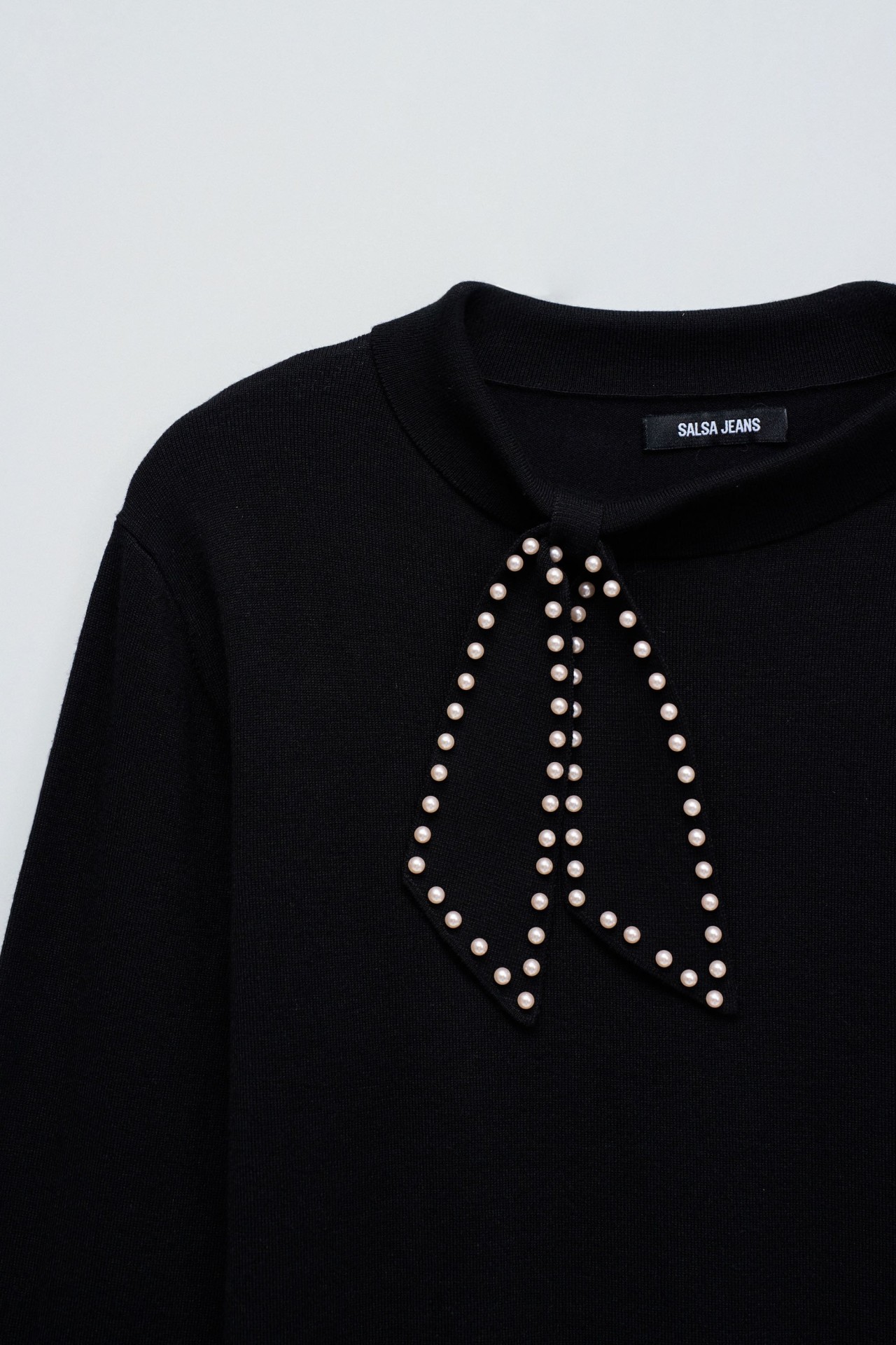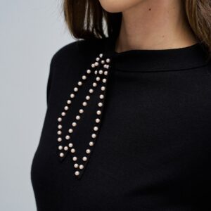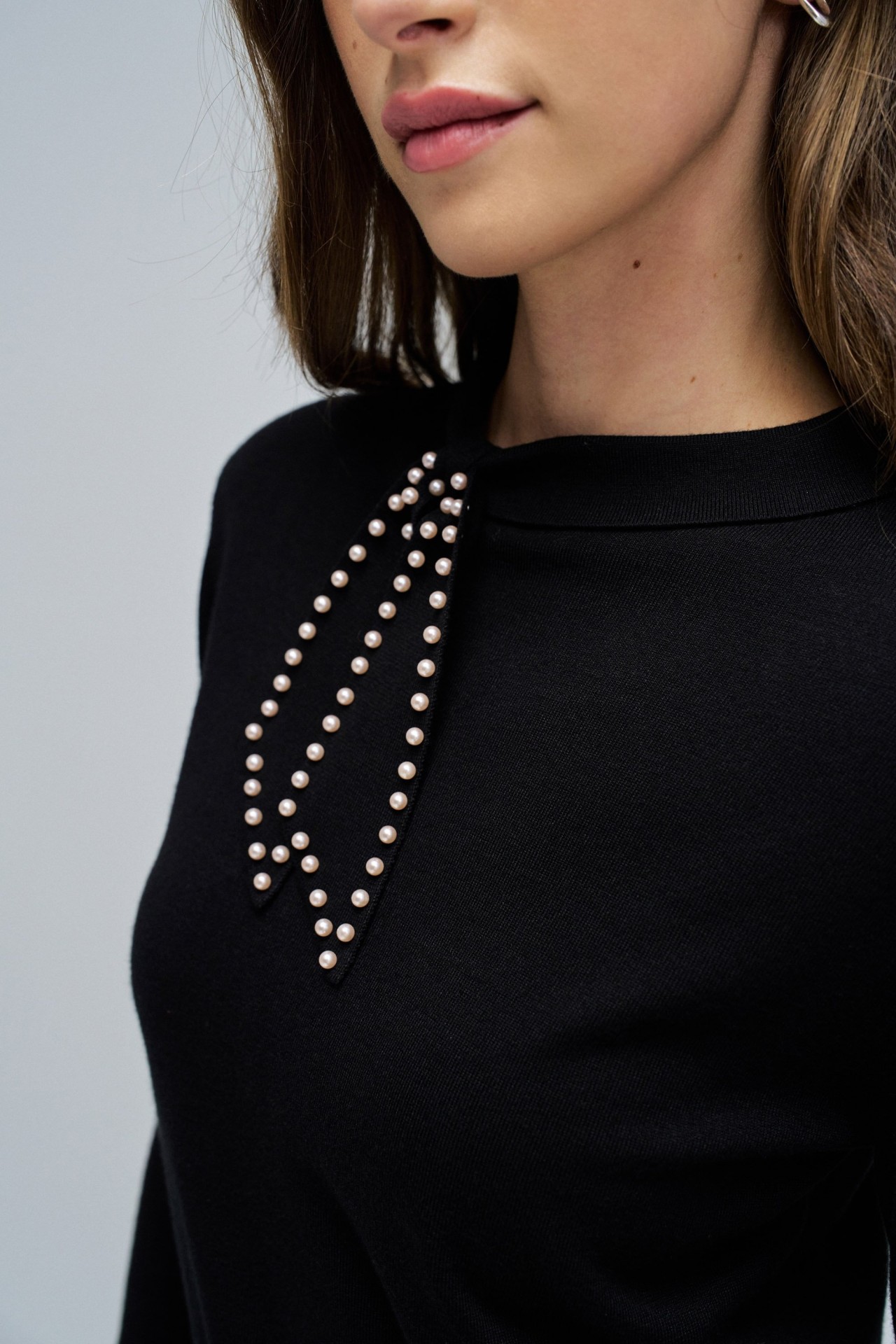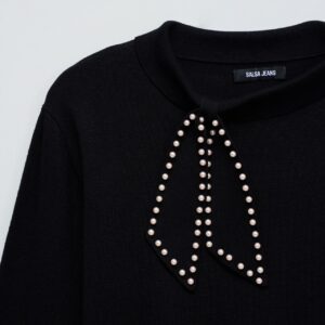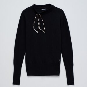 Camisola de malha em tom preto intemporal, com silhueta slim que realça a figura. O detalhe da gola com laço adornado por pérolas acrescenta um toque delicado e sofisticado, transformando uma peça essencial de malha num ícone de feminilidade e charme. As mangas compridas, juntamente com punhos e cintura canelados, garantem conforto e ajuste perfeito, tornando esta camisola ideal para elevar looks do dia a dia ou compor coordenados mais elegantes em ocasiões especiais.