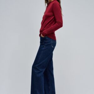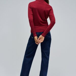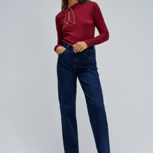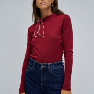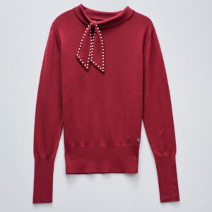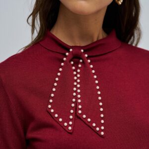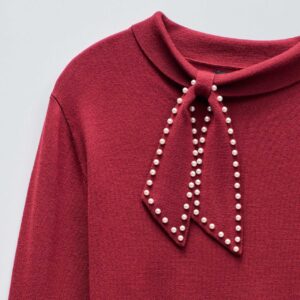 Camisola de malha em tom vermelho, com silhueta slim que realça a figura. O detalhe da gola com laço adornado por pérolas acrescenta um toque delicado e sofisticado, transformando uma peça essencial de malha num ícone de feminilidade e charme. As mangas compridas, juntamente com punhos e cintura canelados, garantem conforto e ajuste perfeito, tornando esta camisola ideal para elevar looks do dia a dia ou compor coordenados mais elegantes em ocasiões especiais.