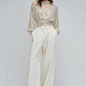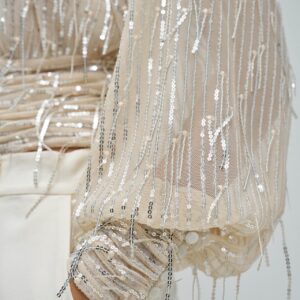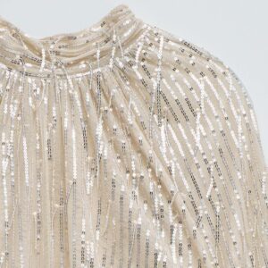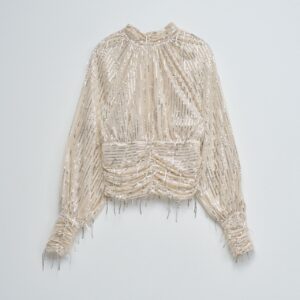 Esta blusa com lantejoulas é pura festa, uma peça feita para brilhar sob as luzes e acompanhar cada movimento com elegância. As franjas cintilantes criam um efeito de dança e leveza, enquanto o fit slim e o franzido na zona da cintura desenham a silhueta com sofisticação. As mangas abalonadas em transparência evocam leveza e mistério, enquanto os punhos altos com botões reforçam o charme elegante da peça. Perfeita para conjugar com calças de efeito pele ou uma saia cintada, esta blusa foi feita para quem quer celebrar a temporada com confiança e glamour, deixando um rasto de luz por onde passa.
