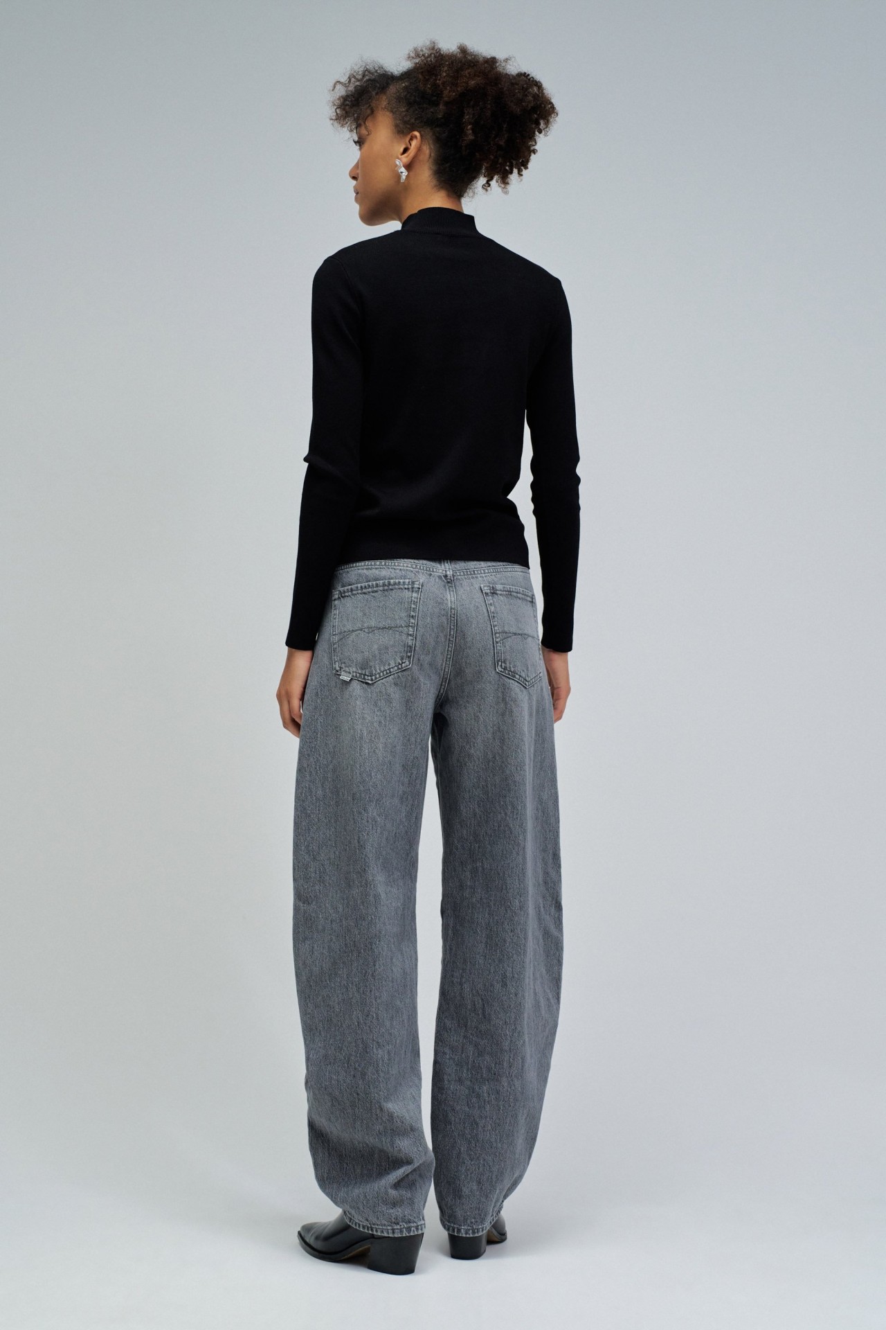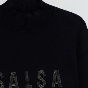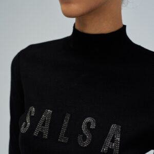 Camisola de malha canelada em tom preto, com corte slim que realça a silhueta. Apresenta gola alta e mangas compridas, num design versátil e elegante. O detalhe de branding com cristais no peito acrescenta um toque de brilho discreto.