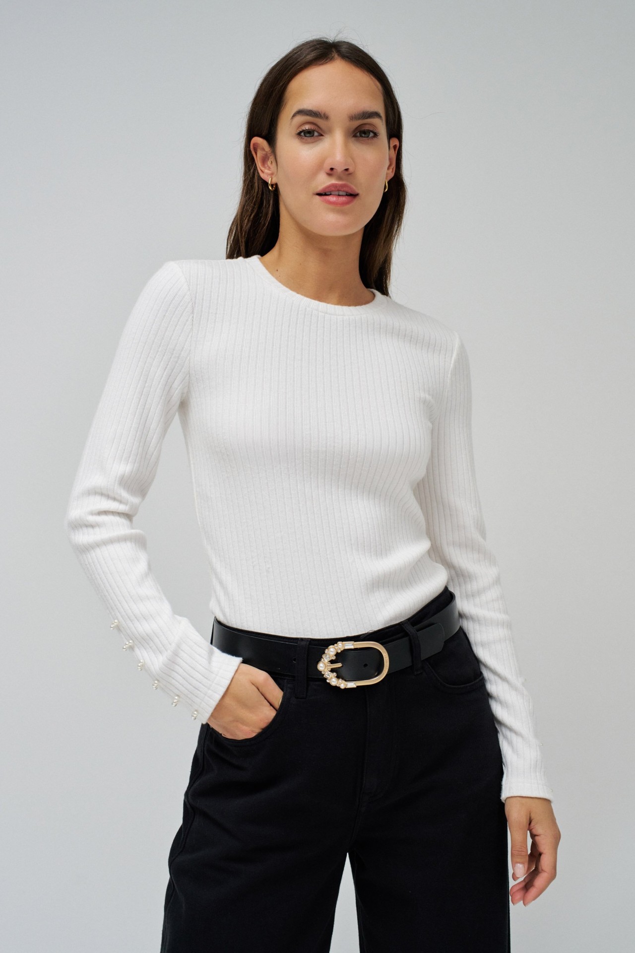 Esta camisola de malha fina canelada é um essencial sofisticado para o teu guarda-roupa. Destaca-se pelo decote redondo e o elegante detalhe de pérolas nas mangas compridas. O fit slim realça a silhueta, garantindo um look feminino e moderno. Versátil e intemporal, é perfeita para qualquer ocasião.