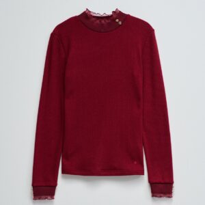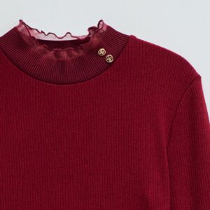 Esta camisola de malha canelada combina o charme da estação com uma subtileza festiva. O fit slim valoriza a silhueta, enquanto os detalhes em tule na meia gola e nos punhos acrescentam leveza e feminilidade. Os botões dourados na gola introduzem um toque de brilho e iluminam os looks das noites especiais.Perfeita para celebrar com estilo, seja em looks descontraídos com jeans ou em combinações mais sofisticadas, com saias e acessórios dourados.