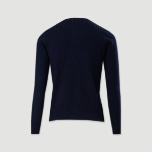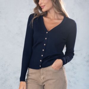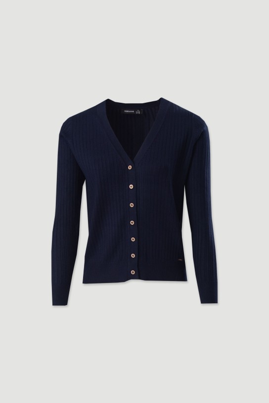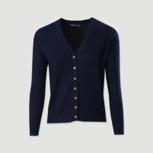 Cardigan em malha canelada com design clássico e versátil. Apresenta decote em V profundo, fecho frontal com botões e corte ajustado que valoriza a silhueta. As mangas compridas e o acabamento em punho conferem estrutura, enquanto o detalhe da chapa metálica com o logo na barra acrescenta sofisticação discreta.