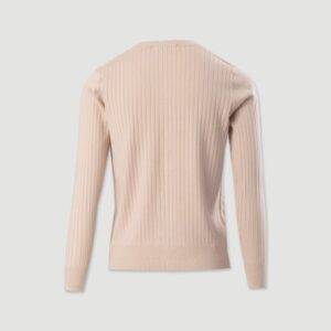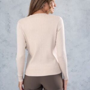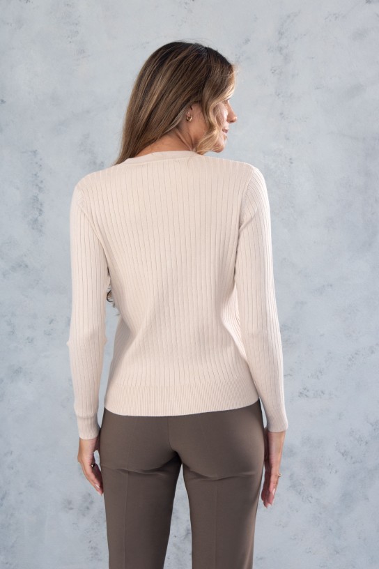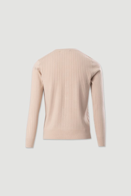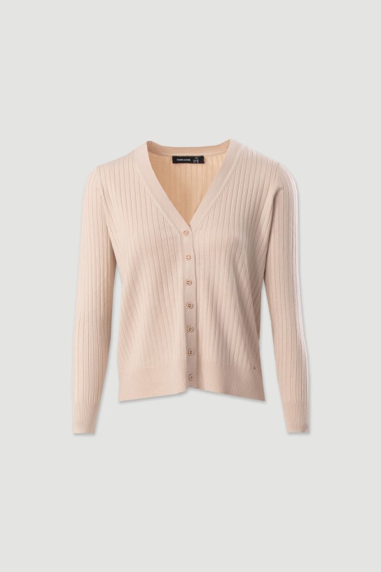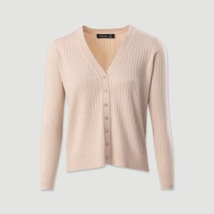 Cardigan em malha canelada com design clássico e versátil. Apresenta decote em V profundo, fecho frontal com botões e corte ajustado que valoriza a silhueta. As mangas compridas e o acabamento em punho conferem estrutura, enquanto o detalhe da chapa metálica com o logo na barra acrescenta sofisticação discreta.
