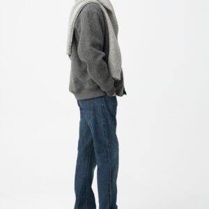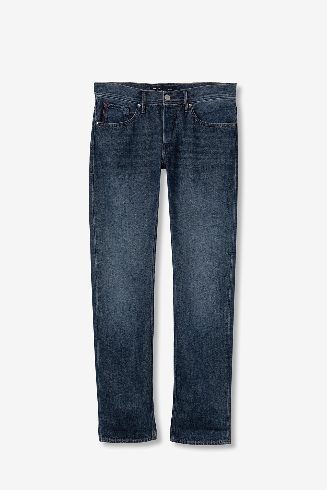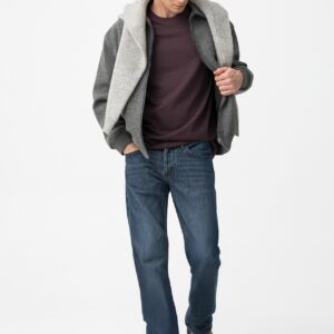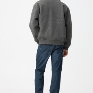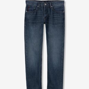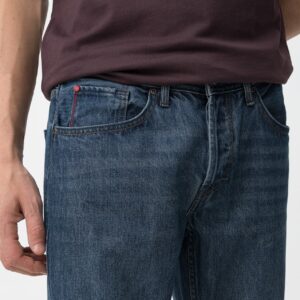Jeans regular fit com cinco bolsos. Fecho frontal com botões ocultos por carcela e botão metálico.