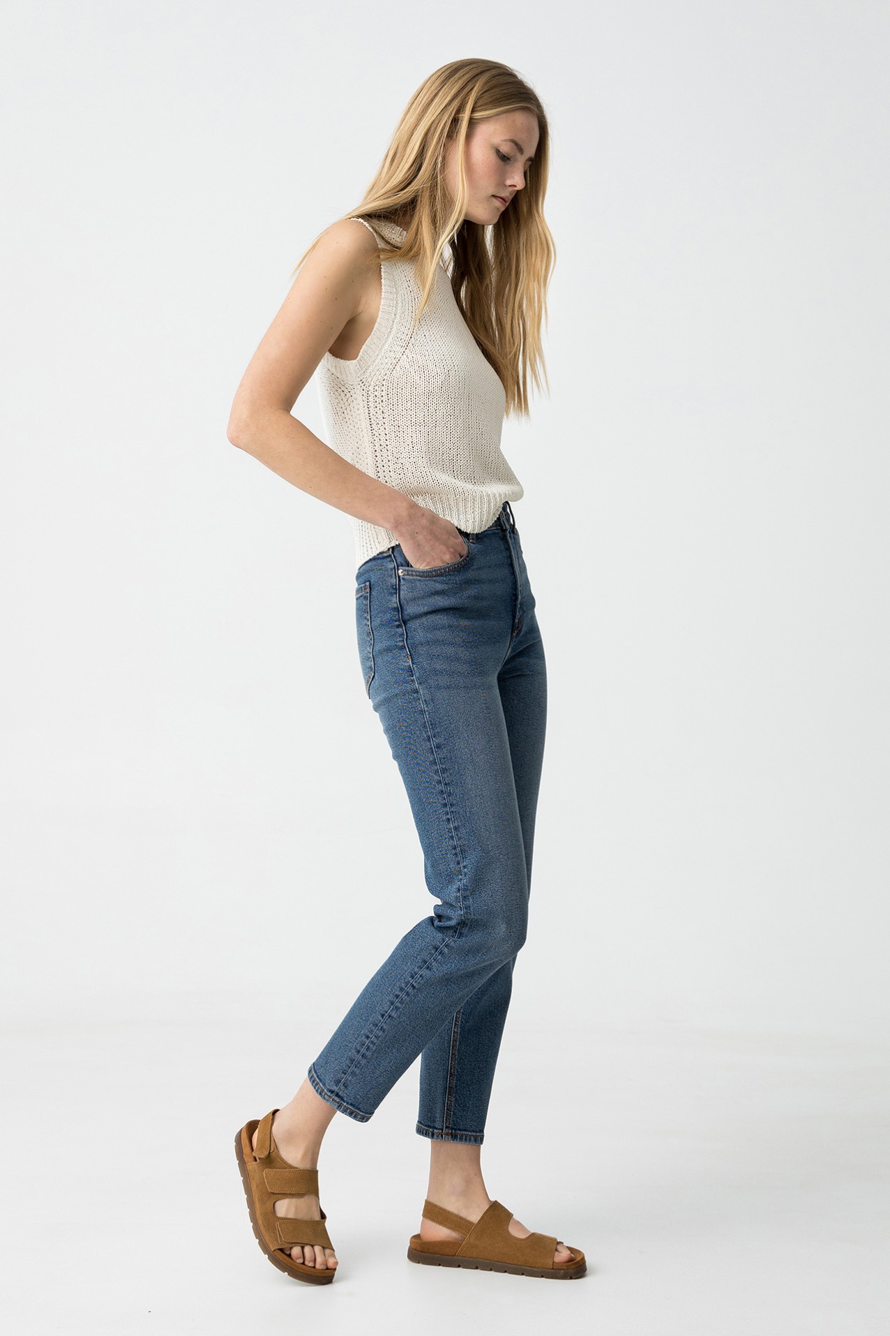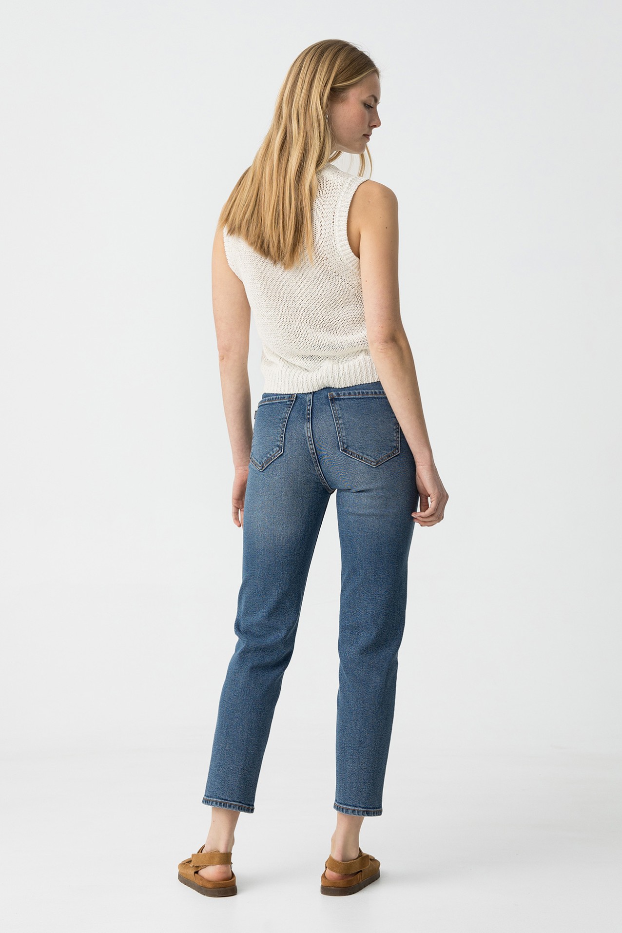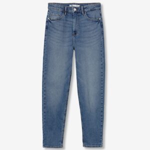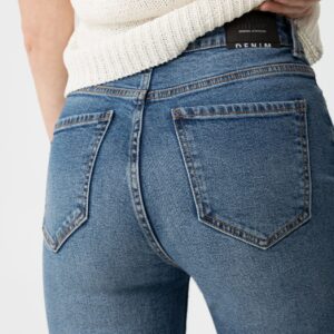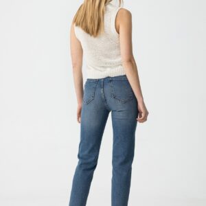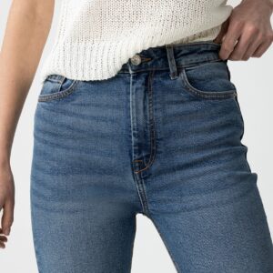 Jeans de cintura alta com cinco bolsos. Fecho frontal com fecho zip e botão metálico.
