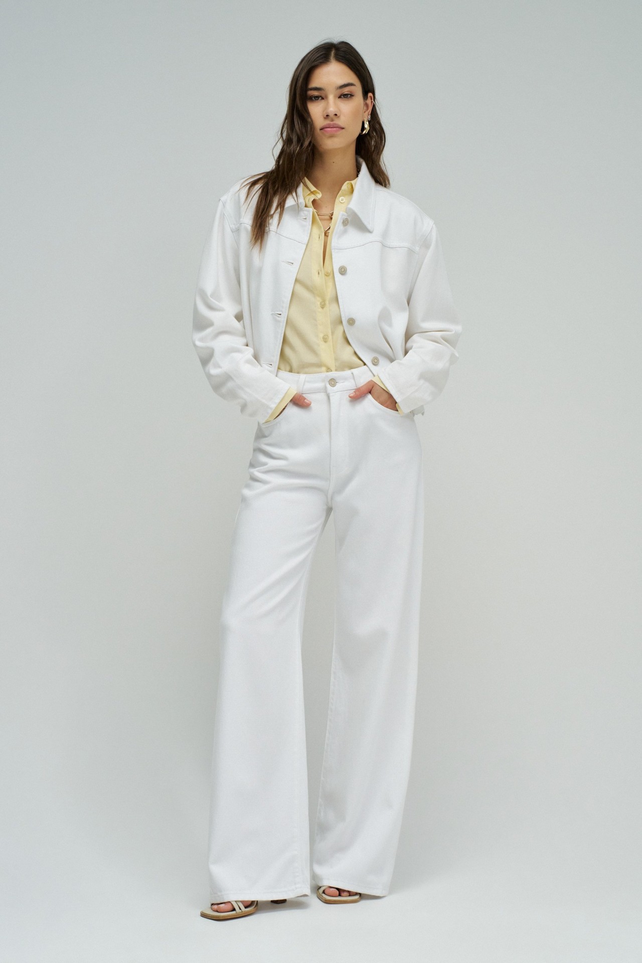 Em branco, estes jeans wide leg afirmam uma silhueta ampla e contemporânea, pensada para dias luminosos e coordenados leves.A perna larga alonga a linha e cria movimento a cada passo, equilibrando estrutura e fluidez. O design clássico de cinco bolsos preserva a herança intemporal do denim, enquanto as presilhas permitem acrescentar um cinto para marcar a cintura ou reforçar uma abordagem mais descontraída.Perfeitos para combinar com o casaco em lightdenim branco, criando um conjunto monocromático fresco e atual, ou para contrastar com peças mais delicadas e fluidas. Uma base versátil que ilumina qualquer composição da estação.