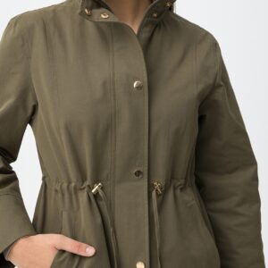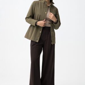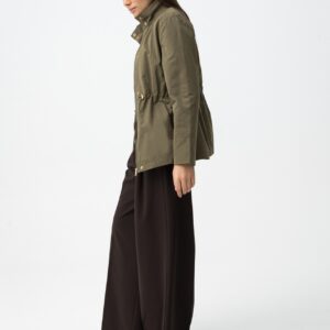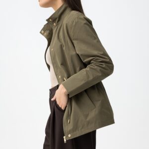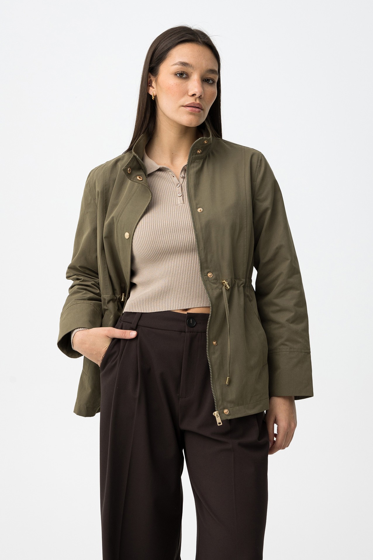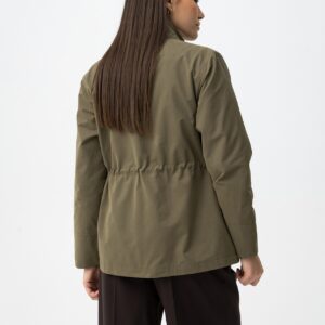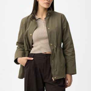 Casaco verde em corte regular, com fecho e botões dourados, ajuste na cintura e bolsos.