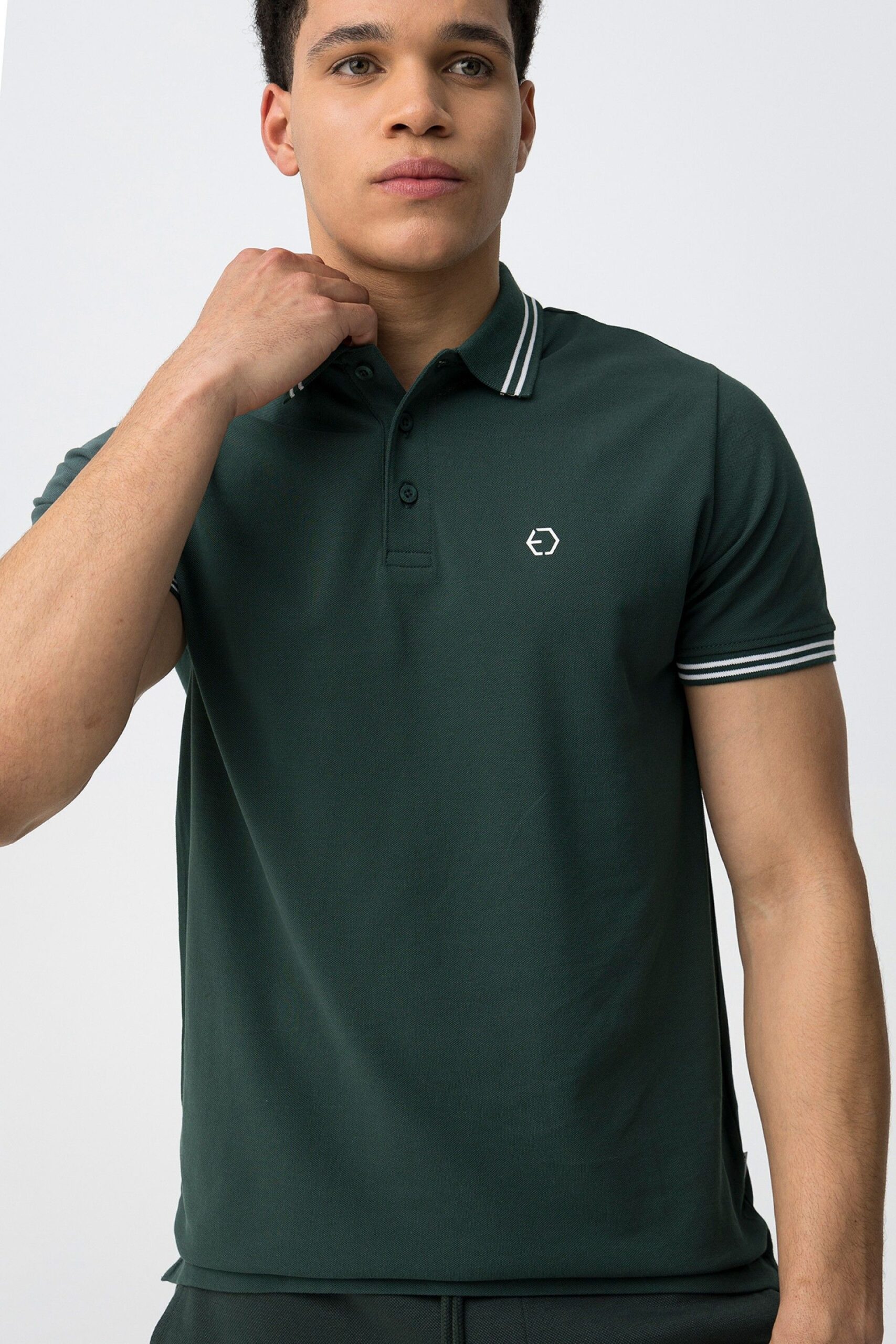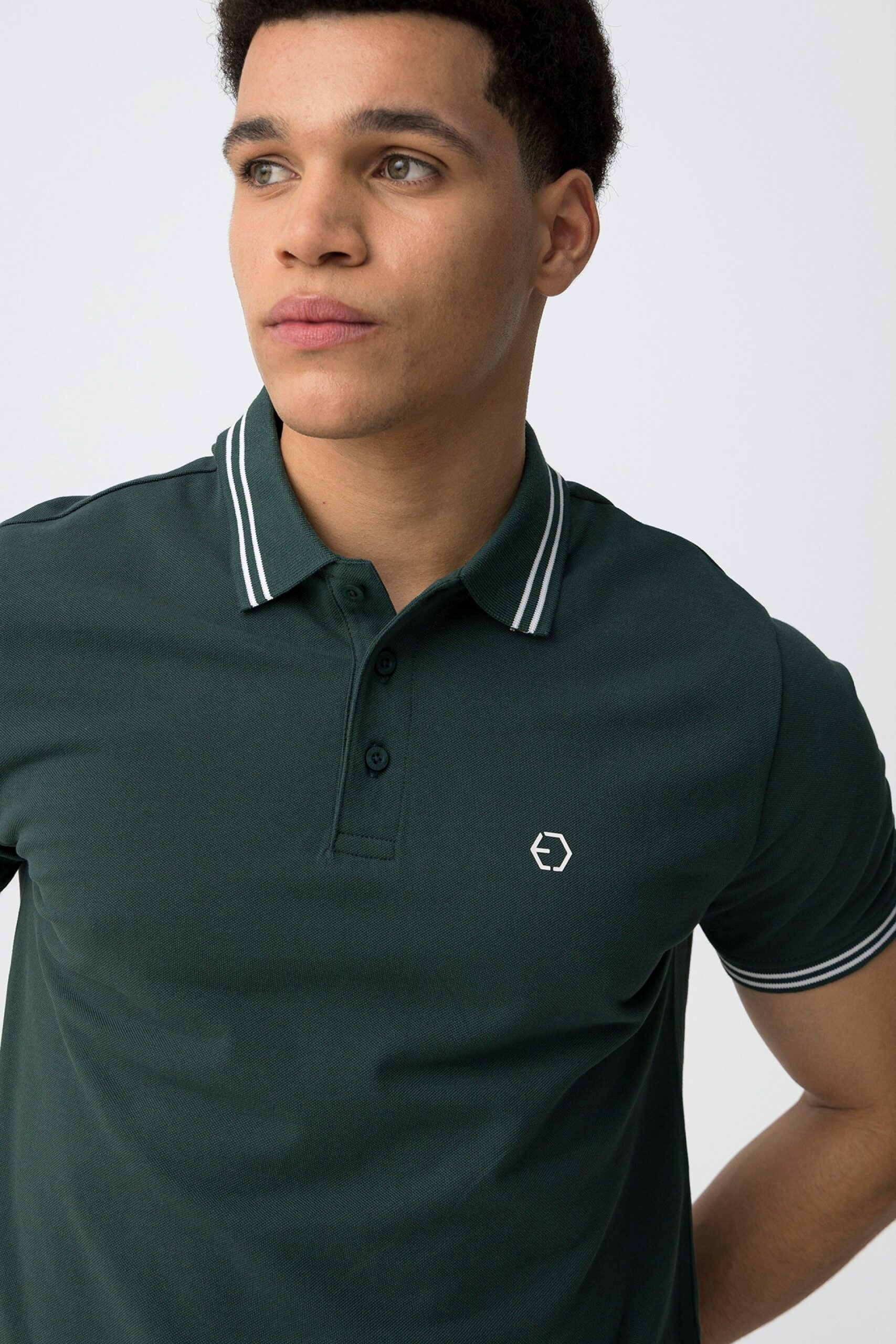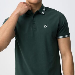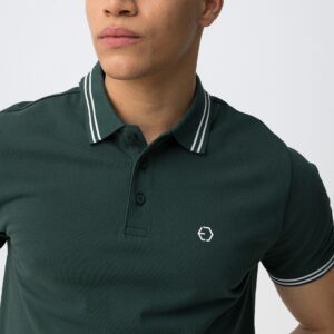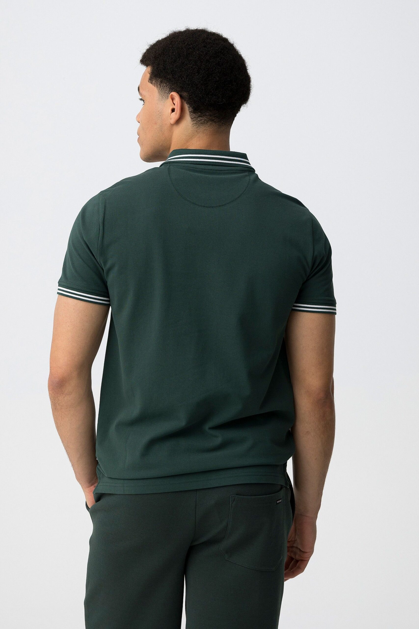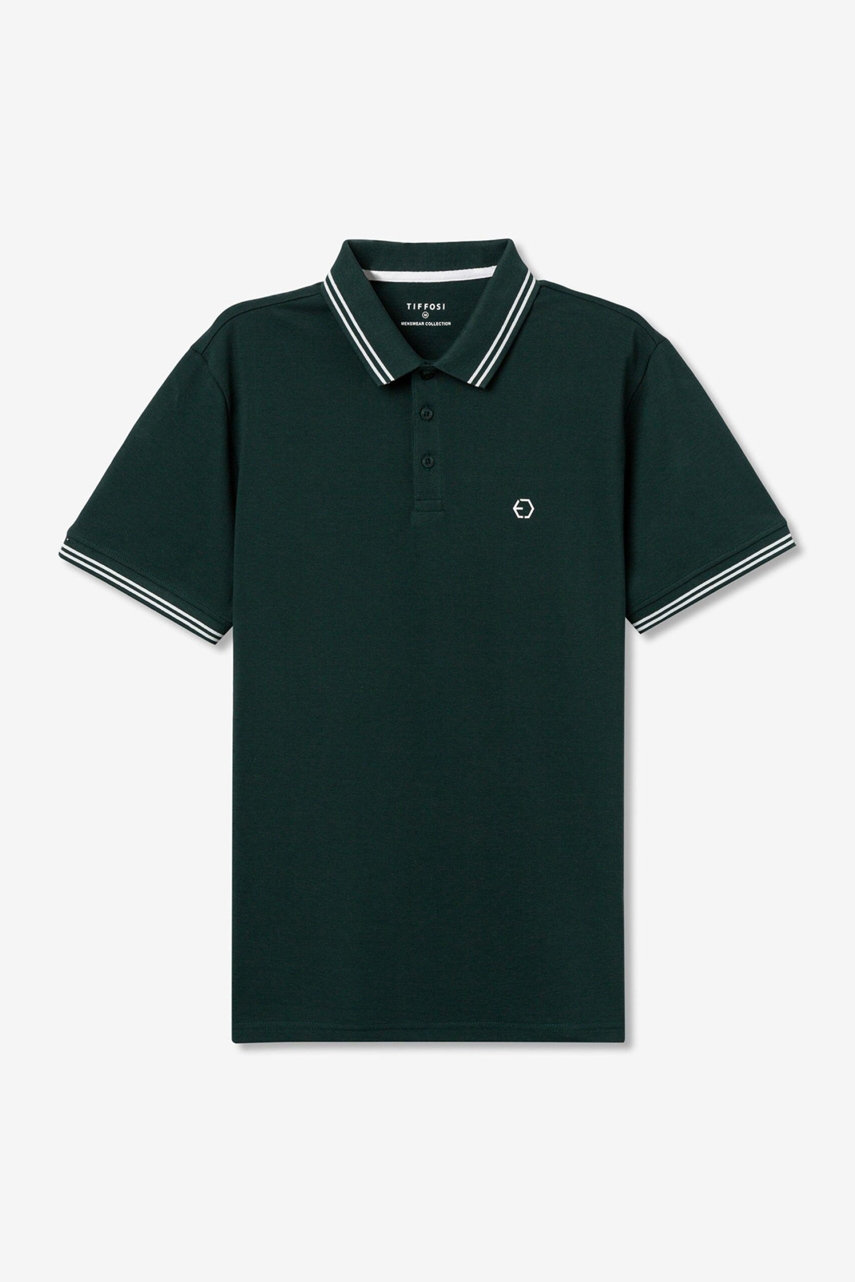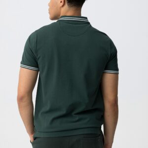 Polo de cor verde escura, corte regular, gola clássica com riscas brancas e fecho de botões.