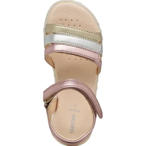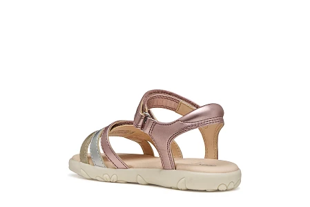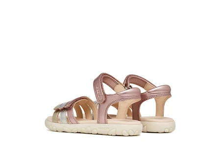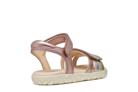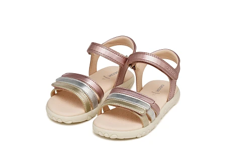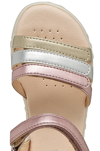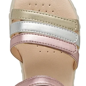 Sandália infantil respirável e confortável, que combina espírito ativo e charme feminino. Aqui apresentada em branco com inserções multicoloridas, a Haiti é um modelo leve e facilmente ajustável com tira. Fabricada em material com efeito de pele, confere um toque desportivo-chique aos looks do dia a dia, na cidade e nas férias.