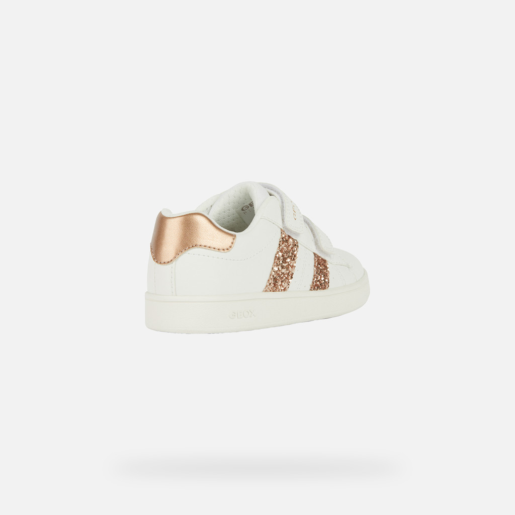 Sneaker low-cut menina de inspiração ténis, com um prático fecho de tira dupla. Nesta variante branca com detalhes em dourado-rosa brilhantes, este modelo completa os looks do dia a dia, seja na escola ou nos tempos livres. Realizado em material efeito pele, este modelo é feminino, confortável e leve, com um look casual impecável.