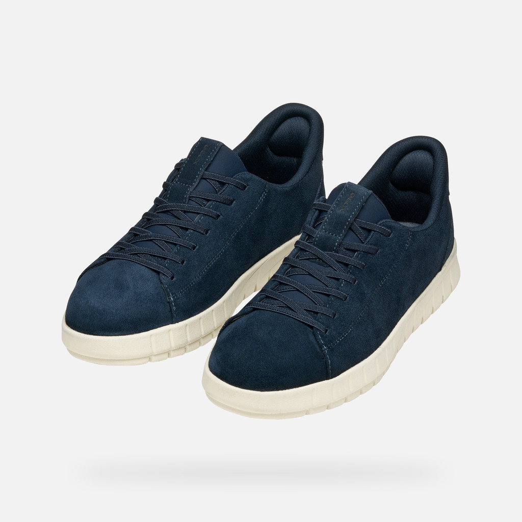 Sneaker masculino flexível e dinâmico, que se destaca pelo calçar fácil e rápido sem o uso das mãos. Nesta versão azul escura, tem uma moderna parte superior em pele. Confortável e respirável, o Flextride Plus é ideal para a vida na cidade.
