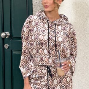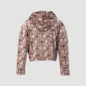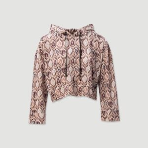 Sweater curta em tecido de veludo estampado, que combina conforto e estilo contemporâneo. Apresenta capuz com aplicação de cordão a contrastar, acrescentando um detalhe moderno e descontraído. Com manga comprida e bolsos frontais, é uma peça prática e distinta, perfeita para coordenados casuais e sofisticados.