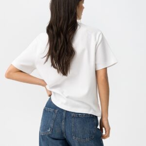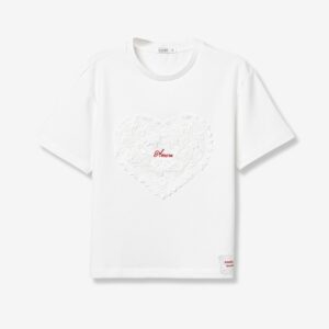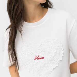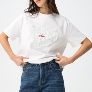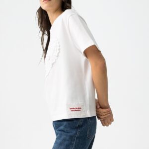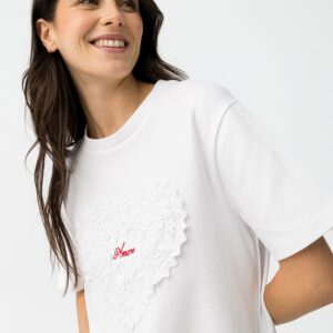T-shirt de cor branca, corte relaxed, manga curta, detalhe em relevo em forma de coração na frente.
