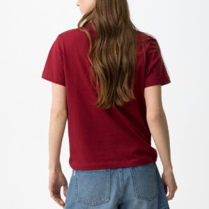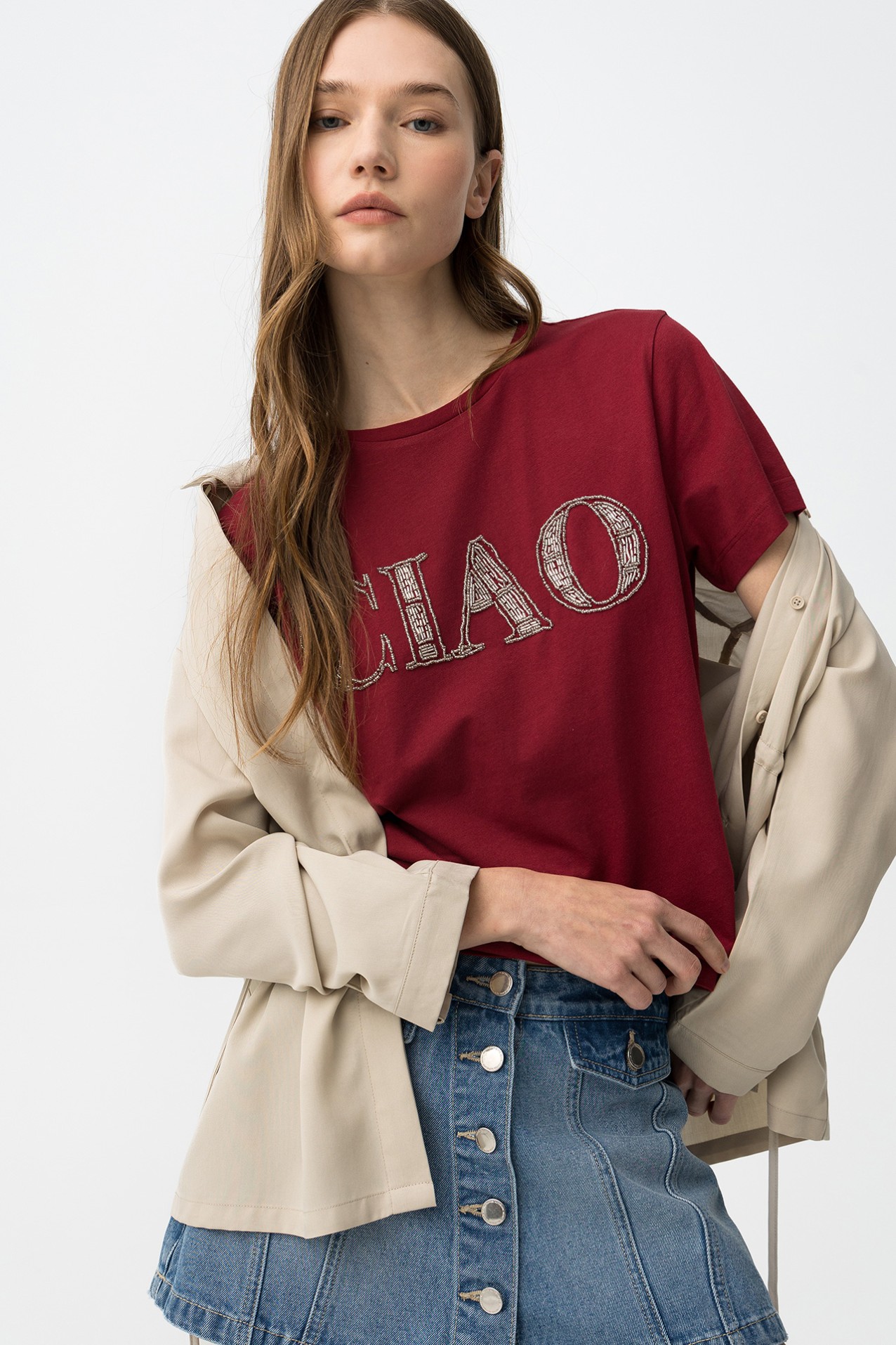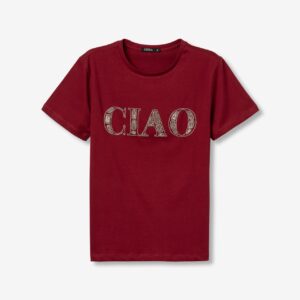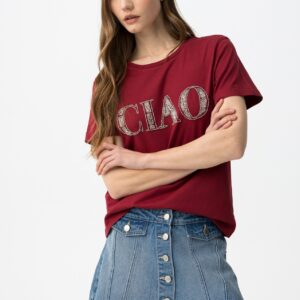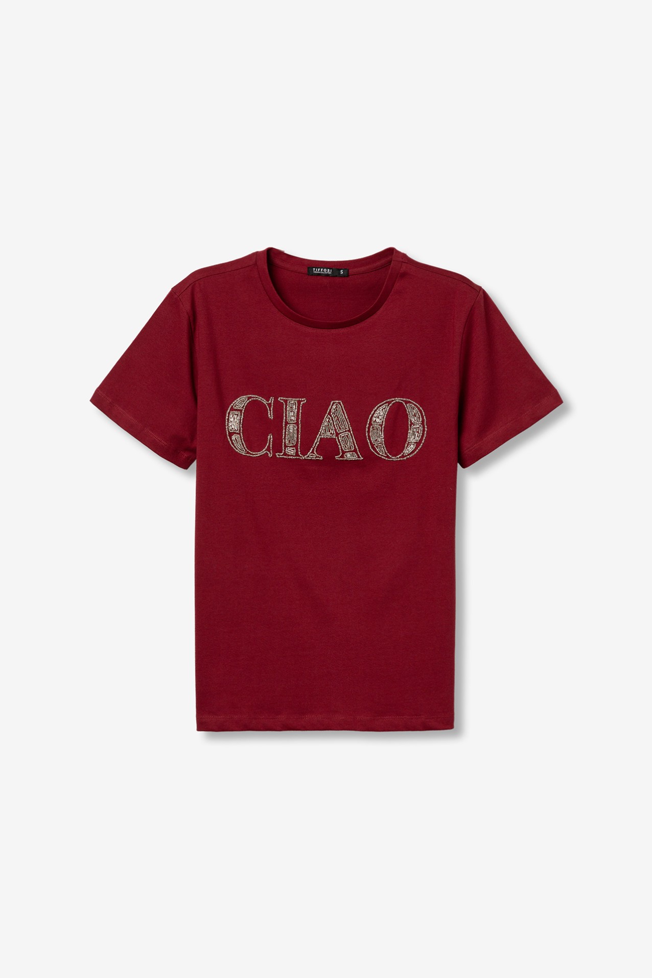 T-shirt de cor vermelha com manga curta e corte regular. Estampa frontal com a palavra ‘CIAO’.