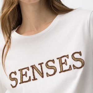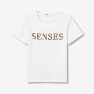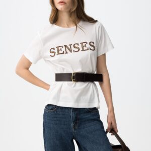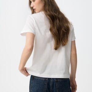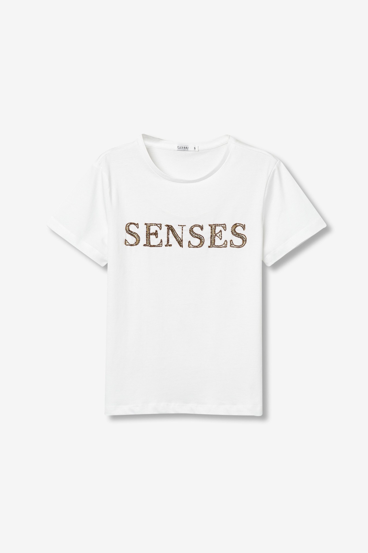 T-shirt branca com mangas curtas e lettering frontal em tom castanho, corte regular descontraído.